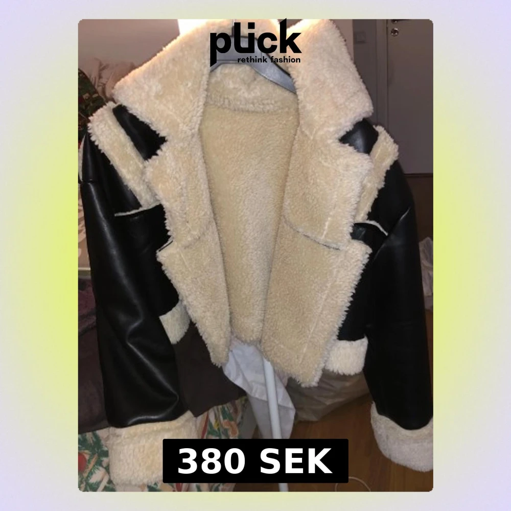 Säljer en svart teddyjacka med krage och detaljer i beige fuskpäls. Jackan har breda slag, synliga sömmar och är fodrad med mjukt teddyfoder. Utsidan är i svart syntetmaterial som ger en skinnlook, medan insidan och muddar är fluffiga och varma.