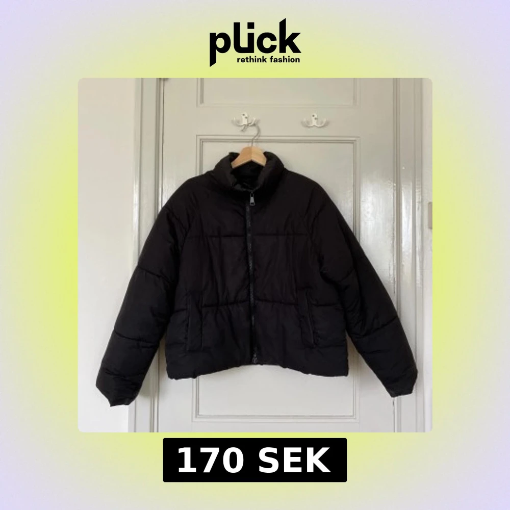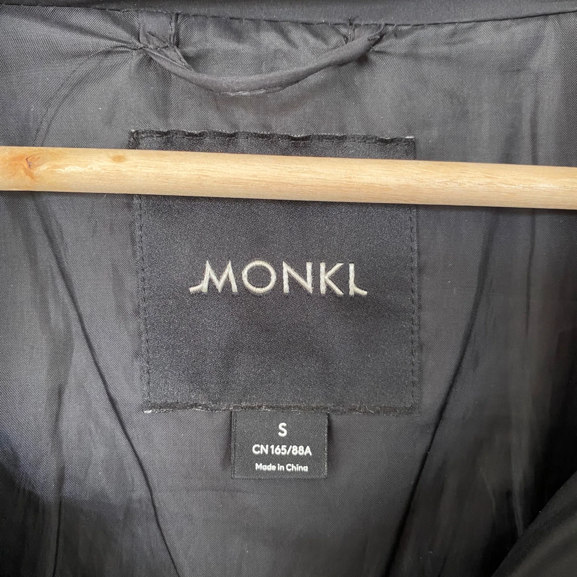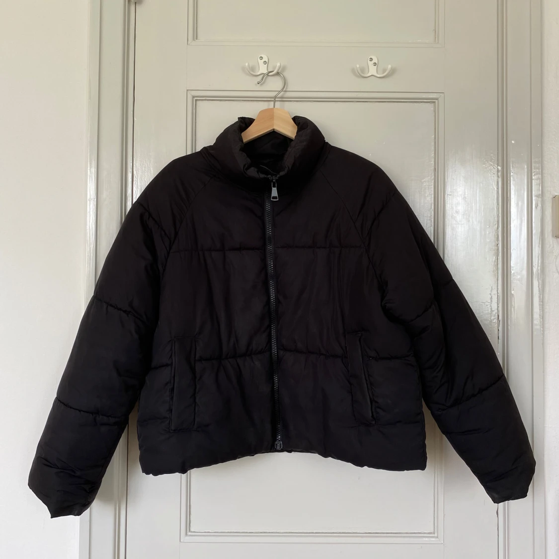 svart pufferjacka från monki i storlek S. jackan har hög krage, raka ärmar, dragkedja framtill och två fickor på sidorna. perfekt för kalla dagar när du vill ha en stilren och enkel look!