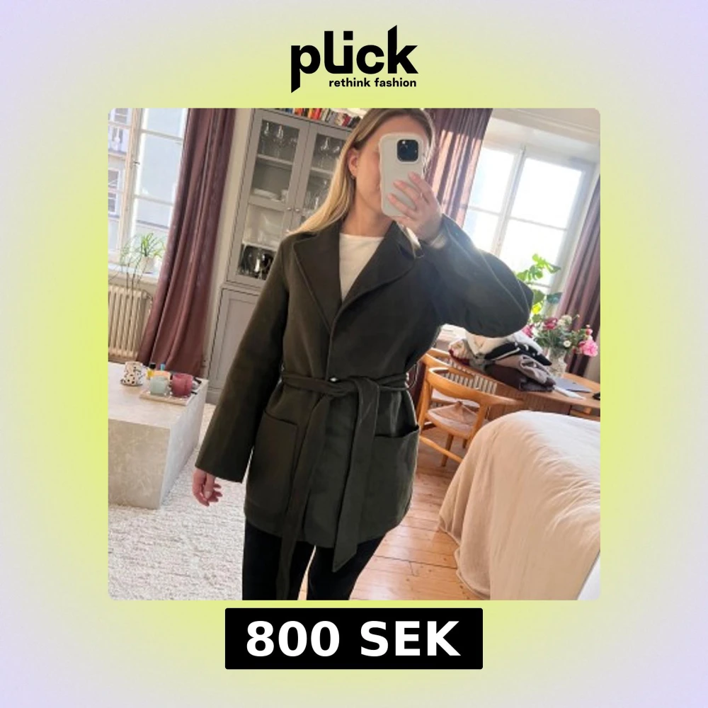 Säljer en stilren mörkgrön kappa med bälte i midjan. Jackan har långa ärmar och stora fickor framtill. Perfekt för höst och vår, tillverkad i en ullblandning för extra värme och komfort.