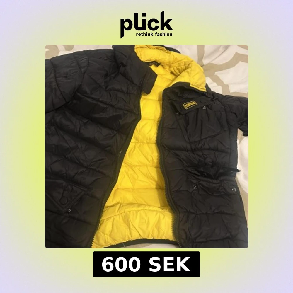 Säljer en svart dunjacka från Barbour International med gul insida. Jackan har dragkedja och flera fickor framtill. Perfekt för kyliga dagar och har en sportig look med Barbour-logga på bröstet.