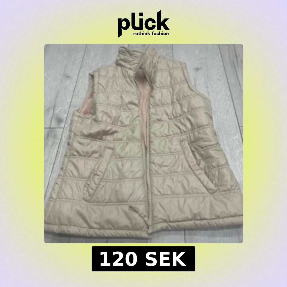 Snygg beige dunväst med quiltad design och hög krage. Västen har två fickor framtill och stängs med dragkedja. Perfekt att slänga över en hoodie eller tröja för extra värme under kyliga dagar.