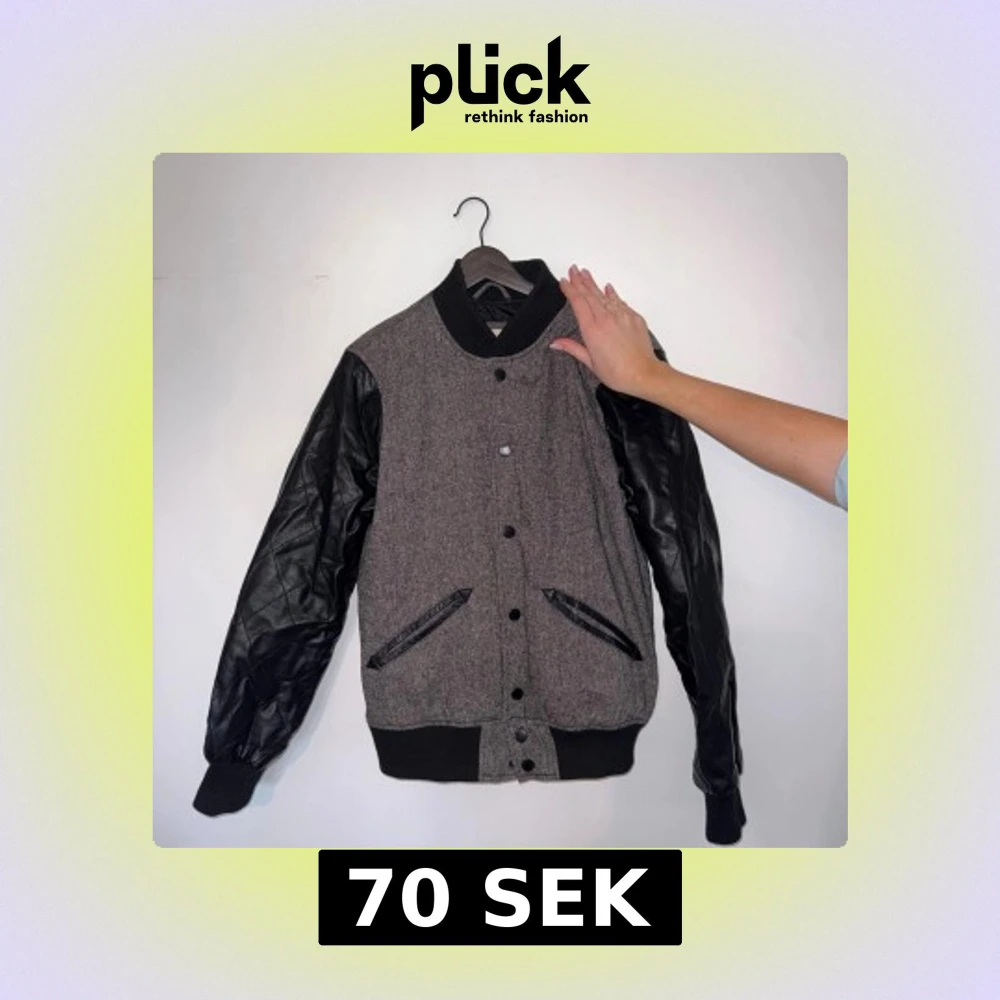 Säljer en grå bomberjacka från Brave Soul med svarta ärmar i skinnimitation och ribbade muddar. Jackan har knappar framtill, två sneda fickor och en klassisk collegekrage. Perfekt för dig som vill ha en stilren och cool look.