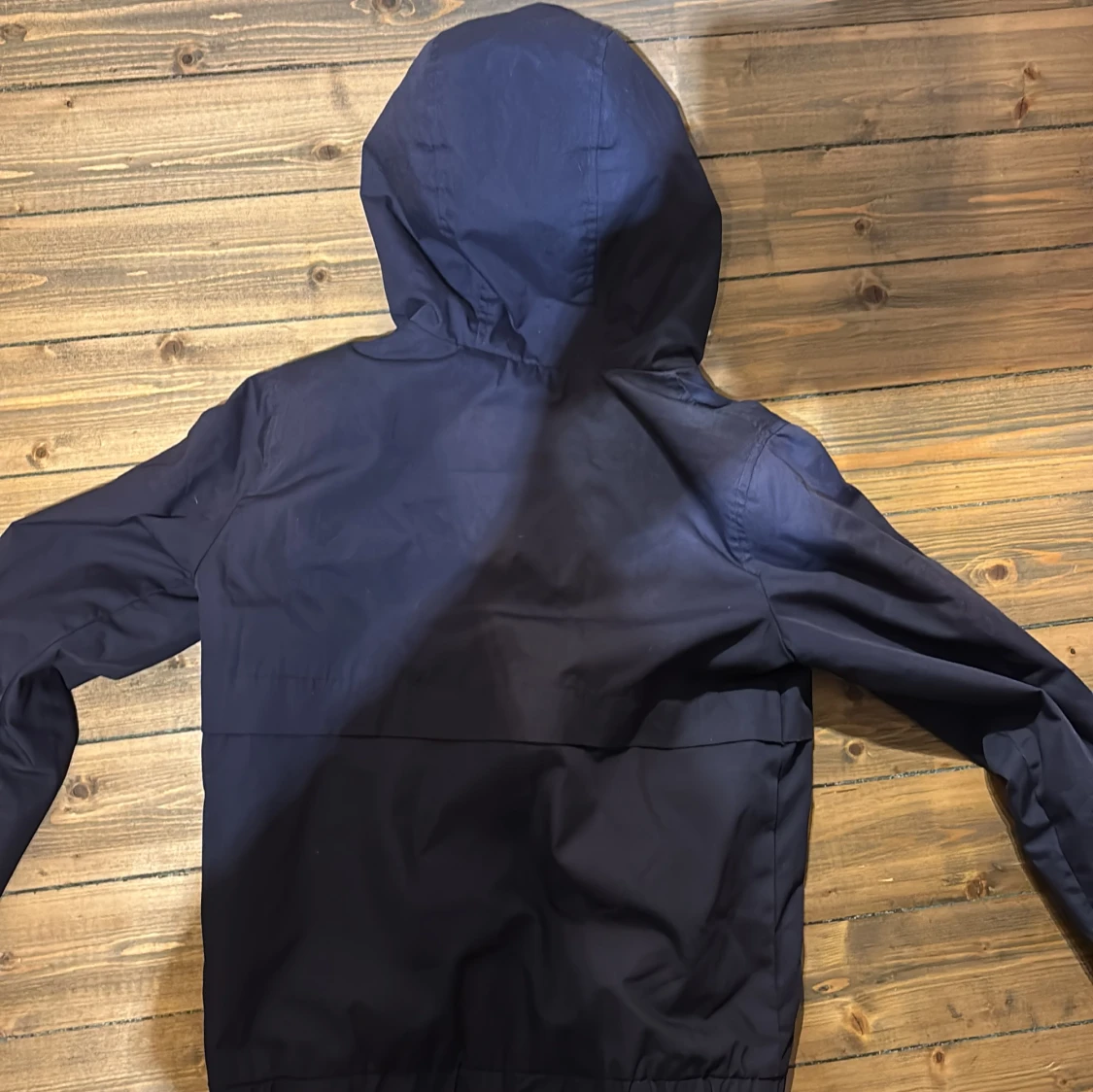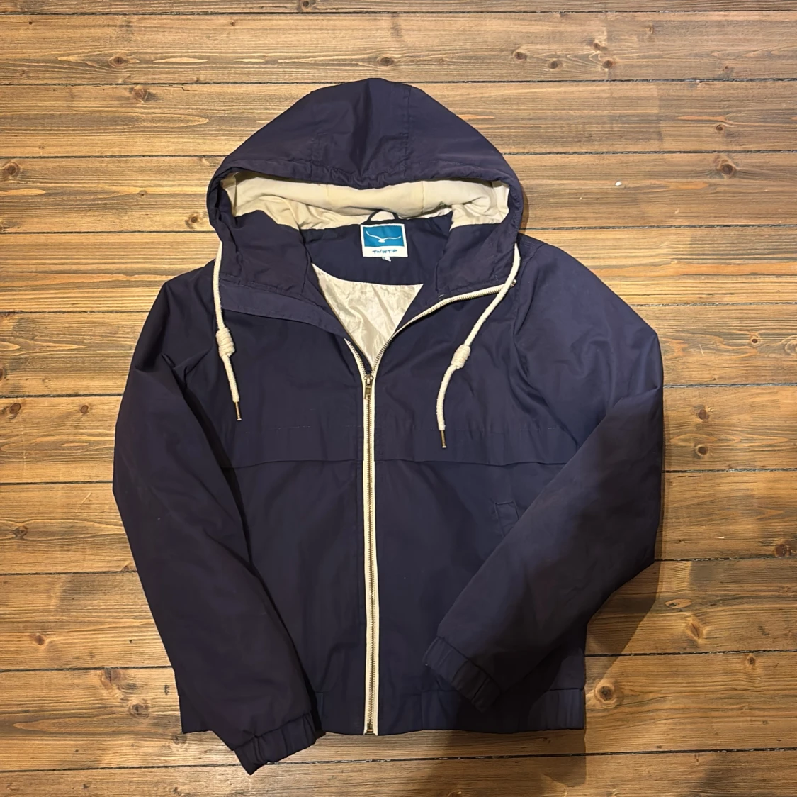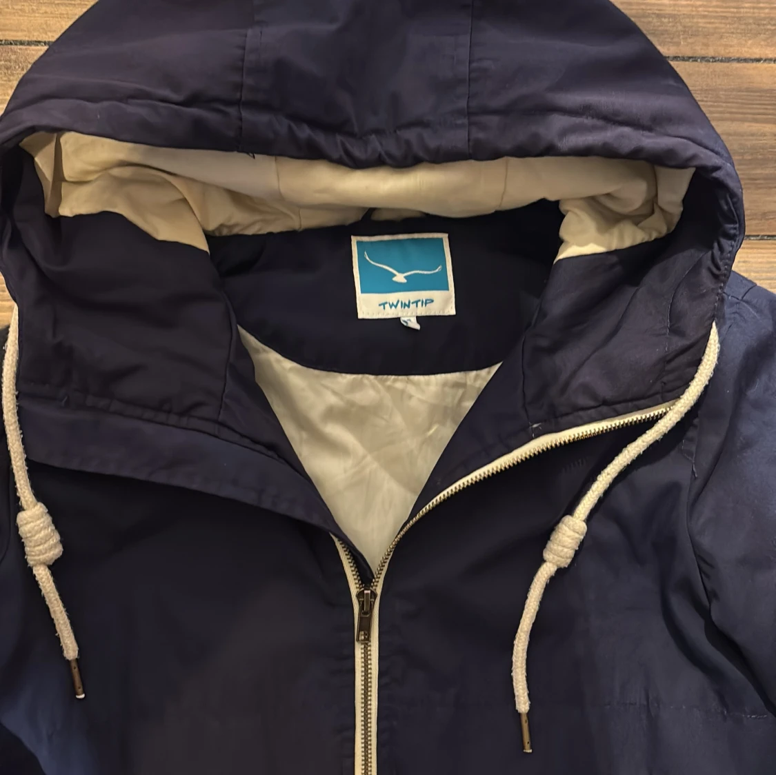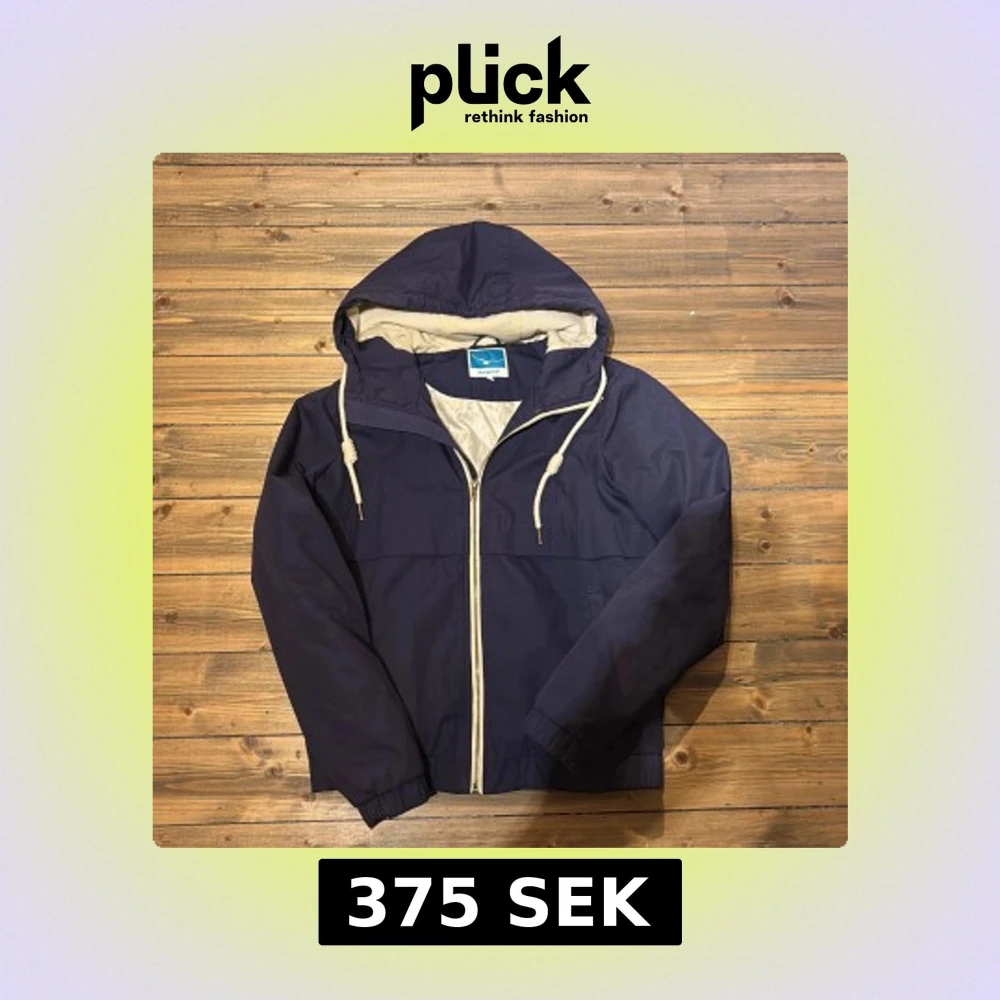 Snygg mörkblå vindjacka från Twintip med huva och vita dragsnören. Jackan har dragkedja framtill, elastiska muddar och ljus insida. Perfekt för blåsiga dagar och enkel att matcha med det mesta.