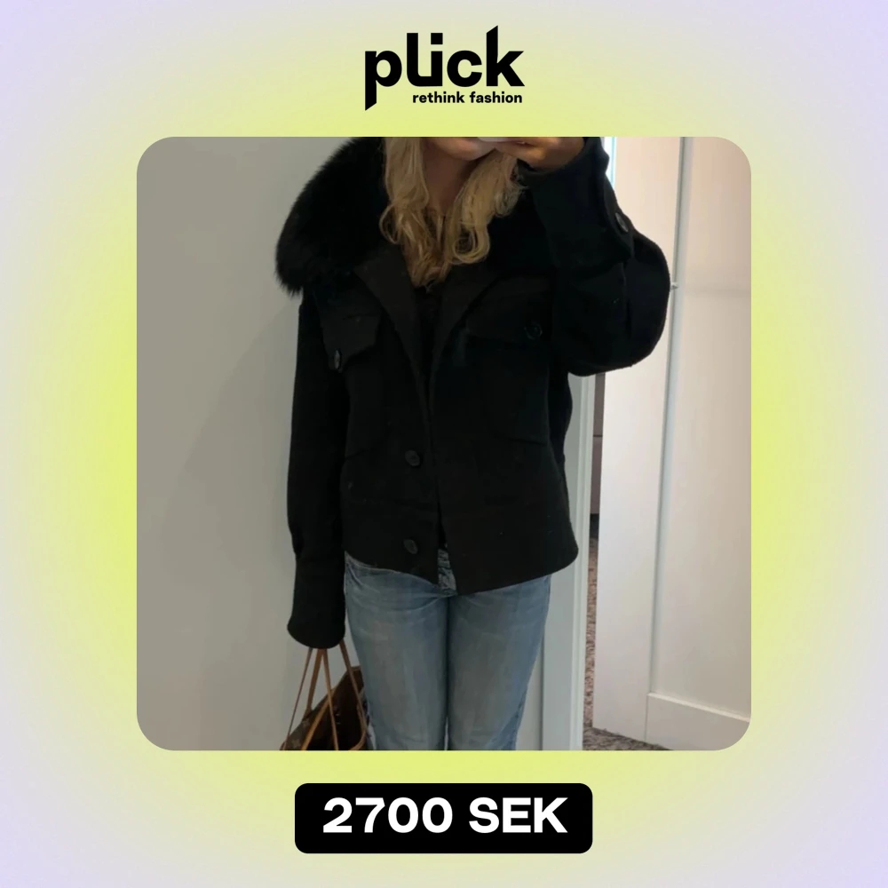 Säljer en snygg svart jacka med pälsdetaljer på kragen. Jackan har en klassisk design med knappar framtill och två fickor på bröstet. Perfekt för höst och vinter, den är använda ett fåtal gånger och är lite nopprig men annars jätte fint skick.