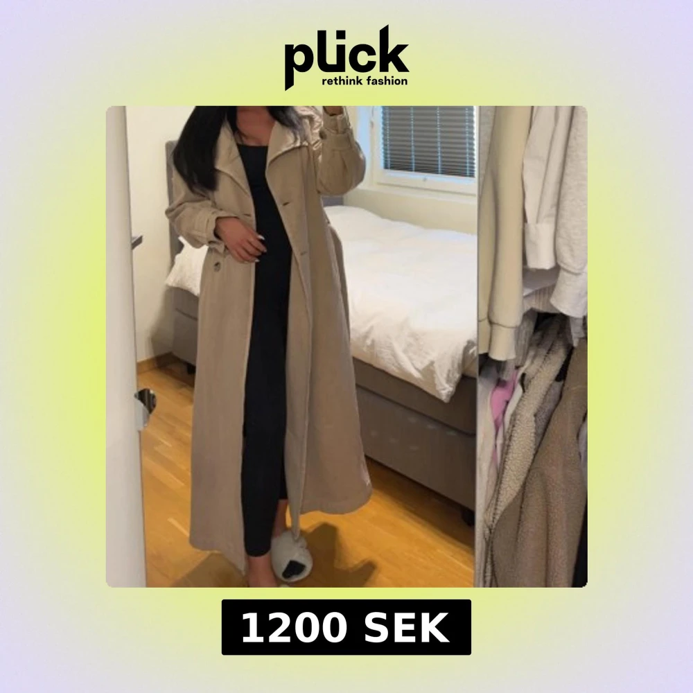 Säljer en lång beige trenchcoat med klassisk krage och knappar framtill. Jackan har en rak passform och är perfekt för övergångssäsonger. Enkel och stilren design som passar till många outfits.