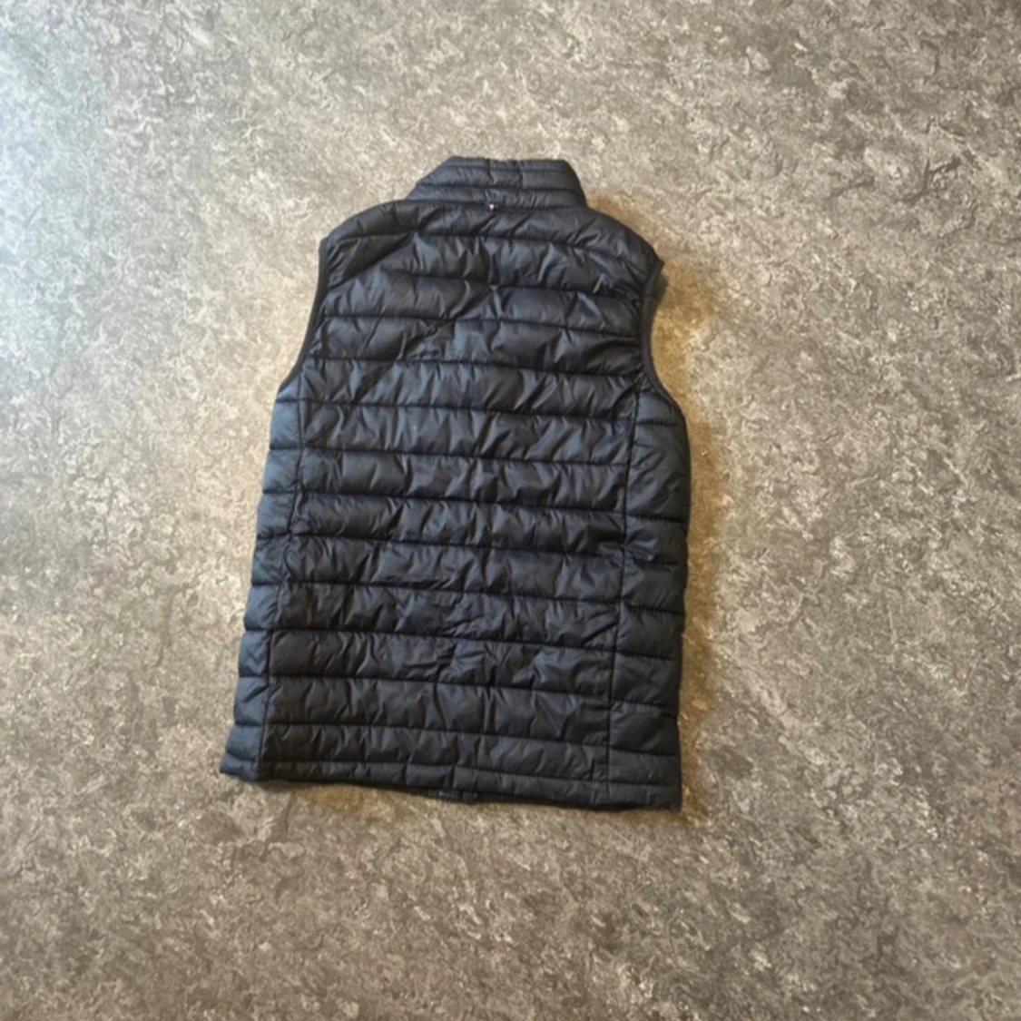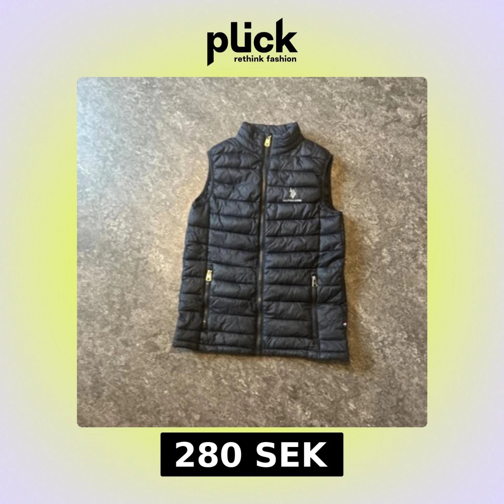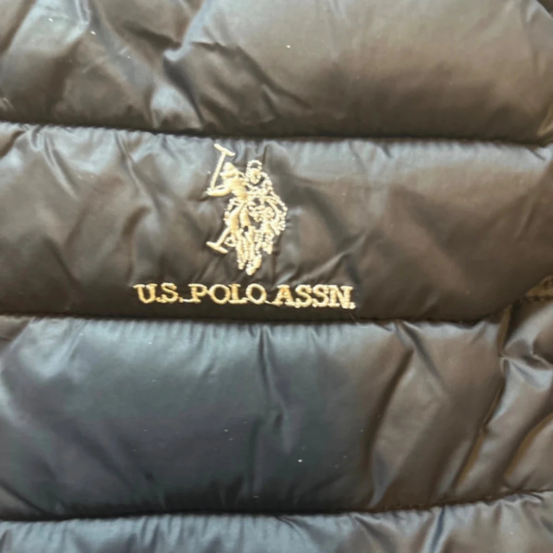 Säljer en svart dunväst från U.S. Polo Assn. med broderad logga på bröstet och klassisk ståkrage. Västen har två fickor med dragkedja och quiltad design. Perfekt att slänga över en hoodie eller tröja när det är kyligt ute.