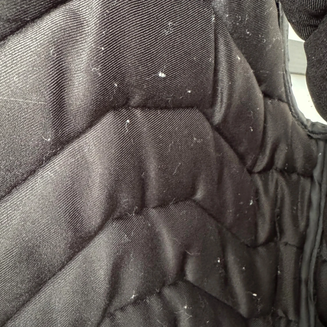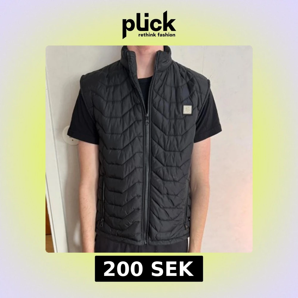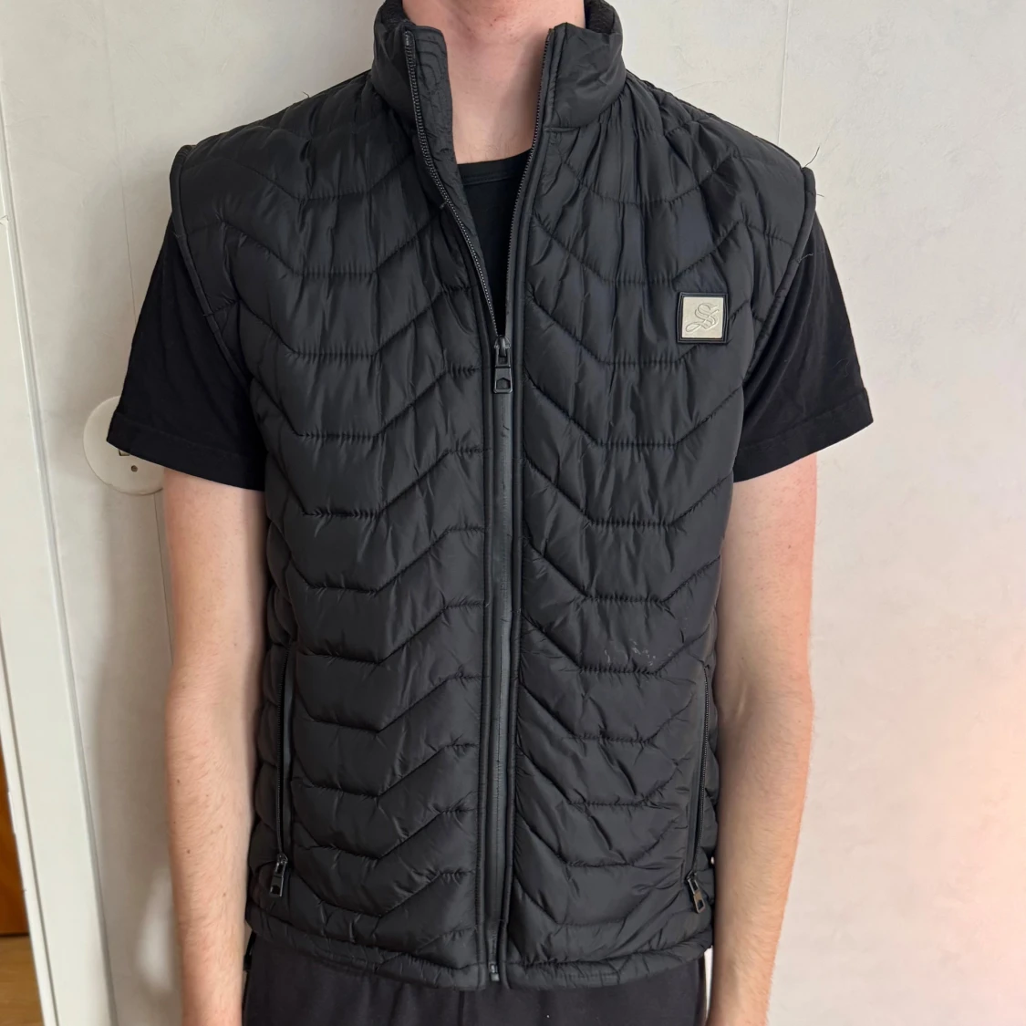 Svart dunväst från SAMS BLACK med quiltat mönster i sicksack, hög krage och dragkedja framtill. Västen har två fickor med dragkedja och en liten logga på bröstet. (Katt finns i hemmet) nypris 500kr (även lite nopprig på insidan men de går att ta bort)