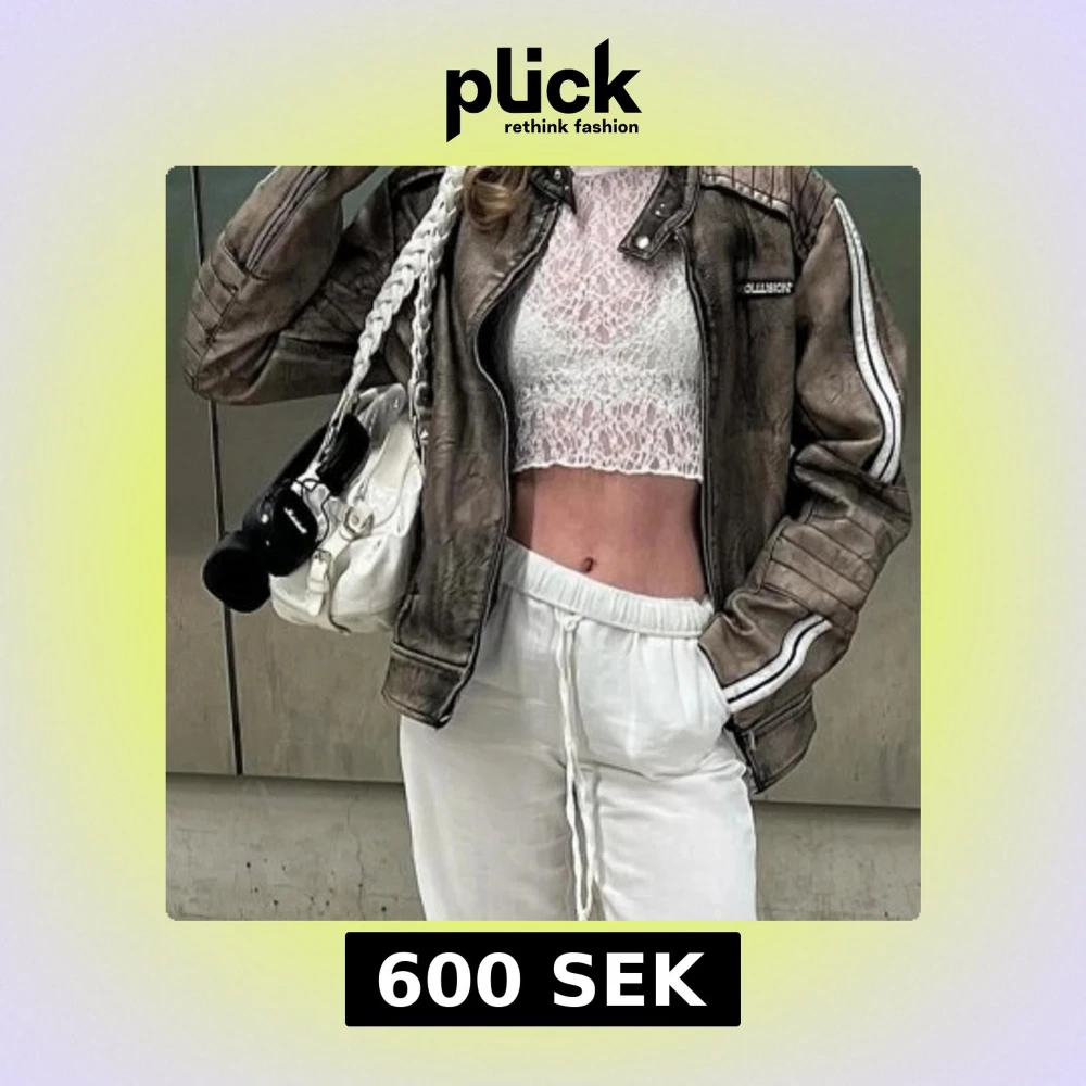 Säljer en brun skinnjacka från Collusion i bikerstil med vita ränder längs ärmarna och coola quiltade detaljer på axlar och armar. Jackan har ståkrage med tryckknapp och dragkedja framtill. Perfekt för dig som vill ha en edgy vibe.
