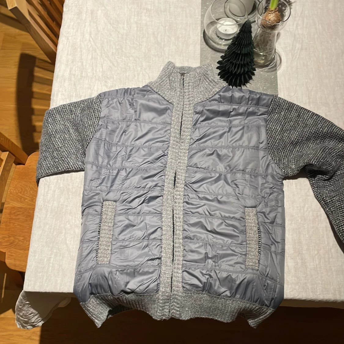 Säljer en grå cardigan pga för stor. Jackan har ribbstickade muddar och två fickor. Perfekt för kyligare dagar.