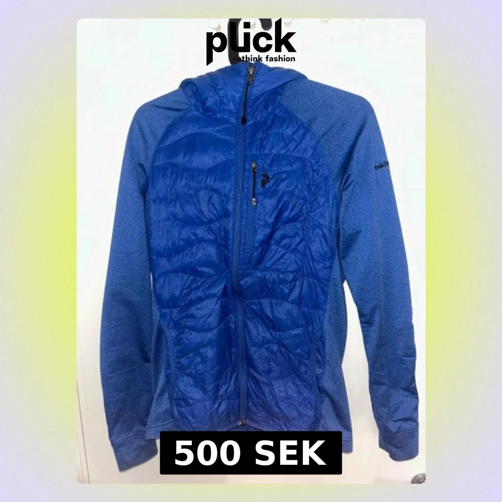 Blå pufferjacka från Peak Performance med huva och hel dragkedja framtill. Jackan har quiltade paneler, sidofickor med dragkedja och broderad logga på ärmen. Materialet är syntet och polyester, perfekt för kyliga dagar. Snygg och sportig look. Pris kan diskuteras vid snabbaffär.