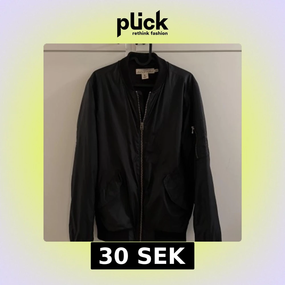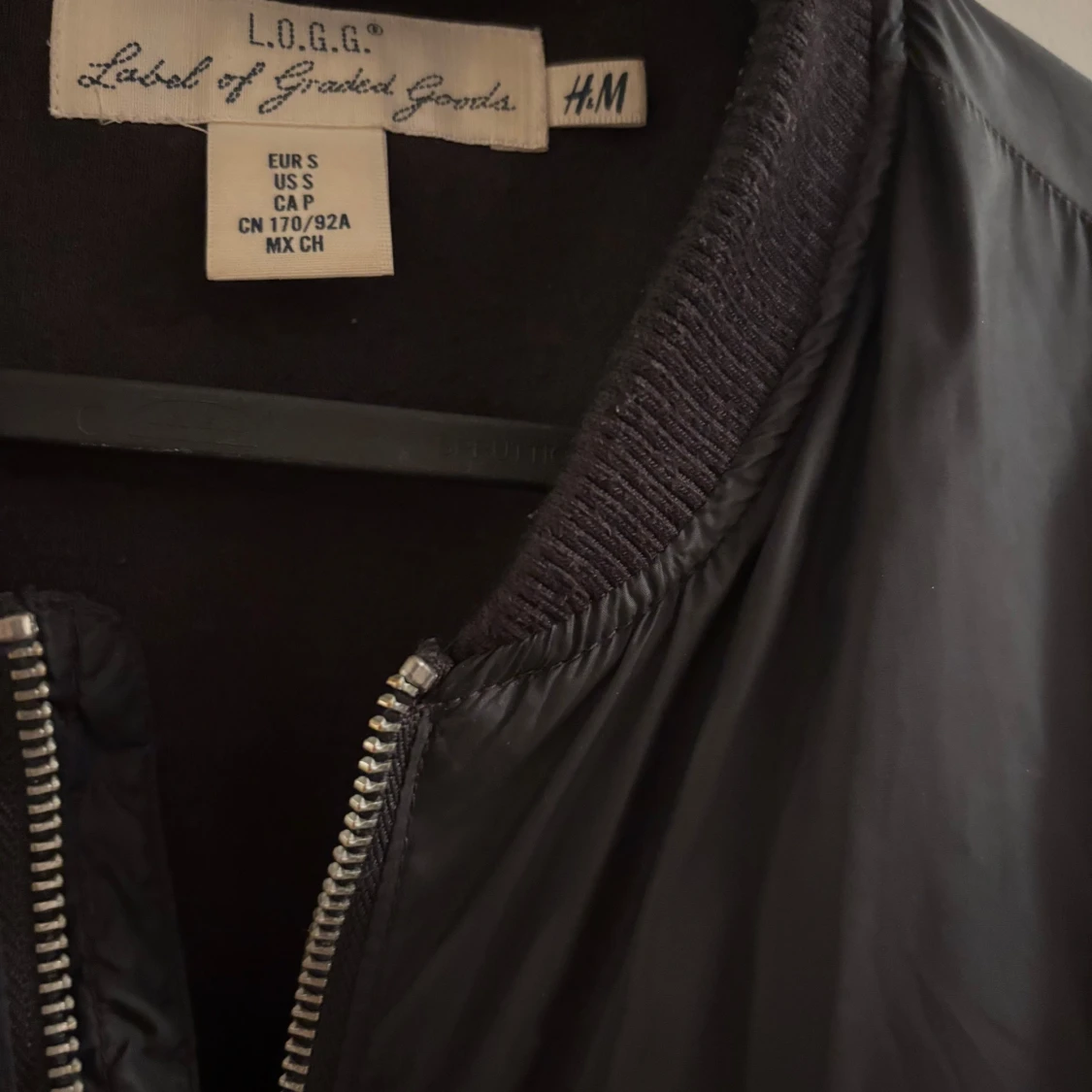 Svart bomberjacka från H&M L.O.G.G. med klassisk ribbad krage, dragkedja framtill och fickor med lock. Jackan har en extra ficka med dragkedja på ärmen och är tillverkad i ett slätt syntetmaterial. Perfekt för en stilren och urban look.