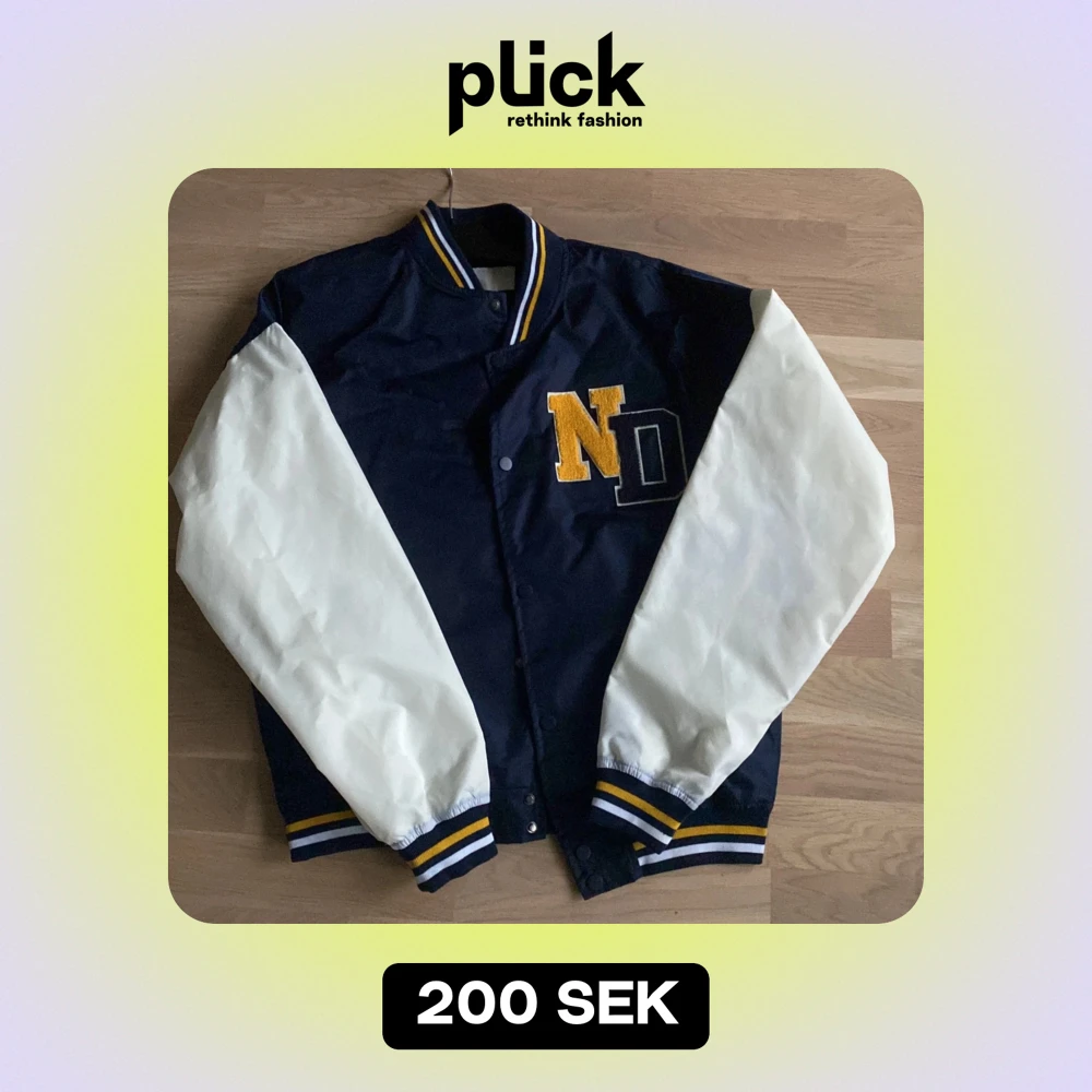 Säljer en snygg blå och vit bomberjacka med broderat ND-märke på bröstet. Jackan har långa vita ärmar och blå kropp, med ribbstickade muddar i blått, vitt och gult. Perfekt för höst och vår!