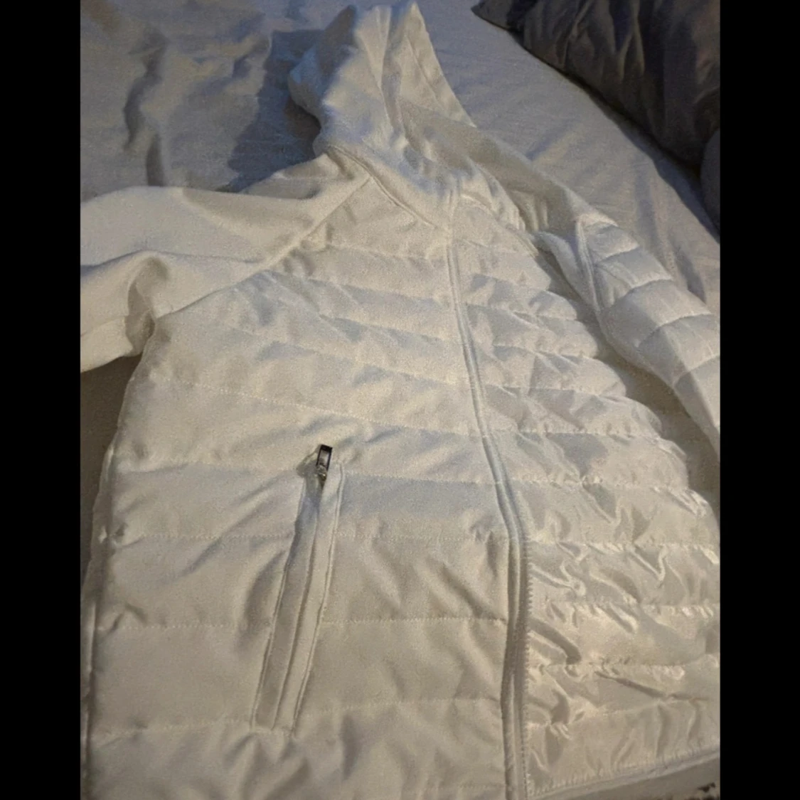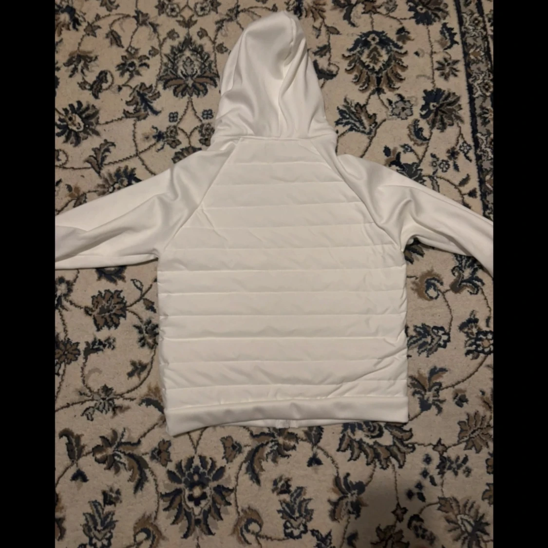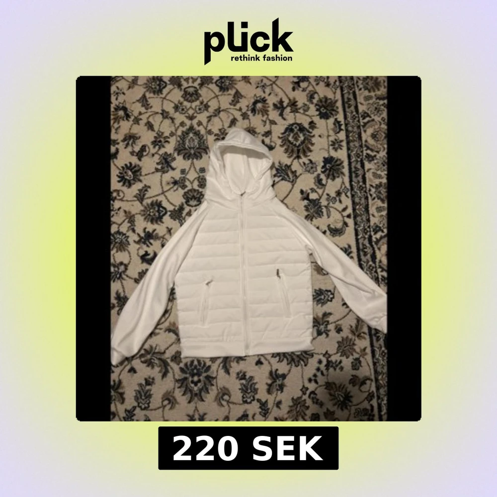 Säljer en stilren vit cardigan med huva och dragkedja framtill. Perfekt för våren och enkel att matcha med olika outfits. Är i allmänt mycket bra skick förutom att de har blivit lite färg i innerfickan för jag haft pennor där men syns ej. Lite smutsig också men går att tvätta. Storlek M passar S