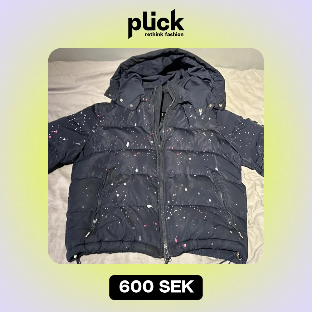 Säljer en svart/mörkblå pufferjacka från NVLTY med coolt färgstänk-mönster i vitt och rosa. Jackan har en mysig huva och dragkedja framtill. Perfekt för kalla dagar när du vill sticka ut lite extra. Den är i bra skick,jackan är mörkblå men ser ut som svart den är helt perfekt till vintern och kalla dagar inga problem med den alls, använd cirka 10 gånger för köpte ny inga problem med den skriv vid frågor eller funderingar