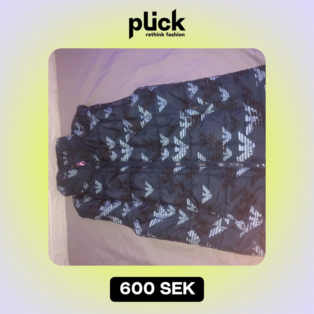 Säljer en snygg pufferjacka från Armani Jeans i storlek S. Jackan har ett coolt mönster i svart och blått med dragkedja framtill. Perfekt för höst och vinter när du vill hålla dig varm och stilren. Passar både till vardags och lite mer uppklädda tillfällen. 🖤💙