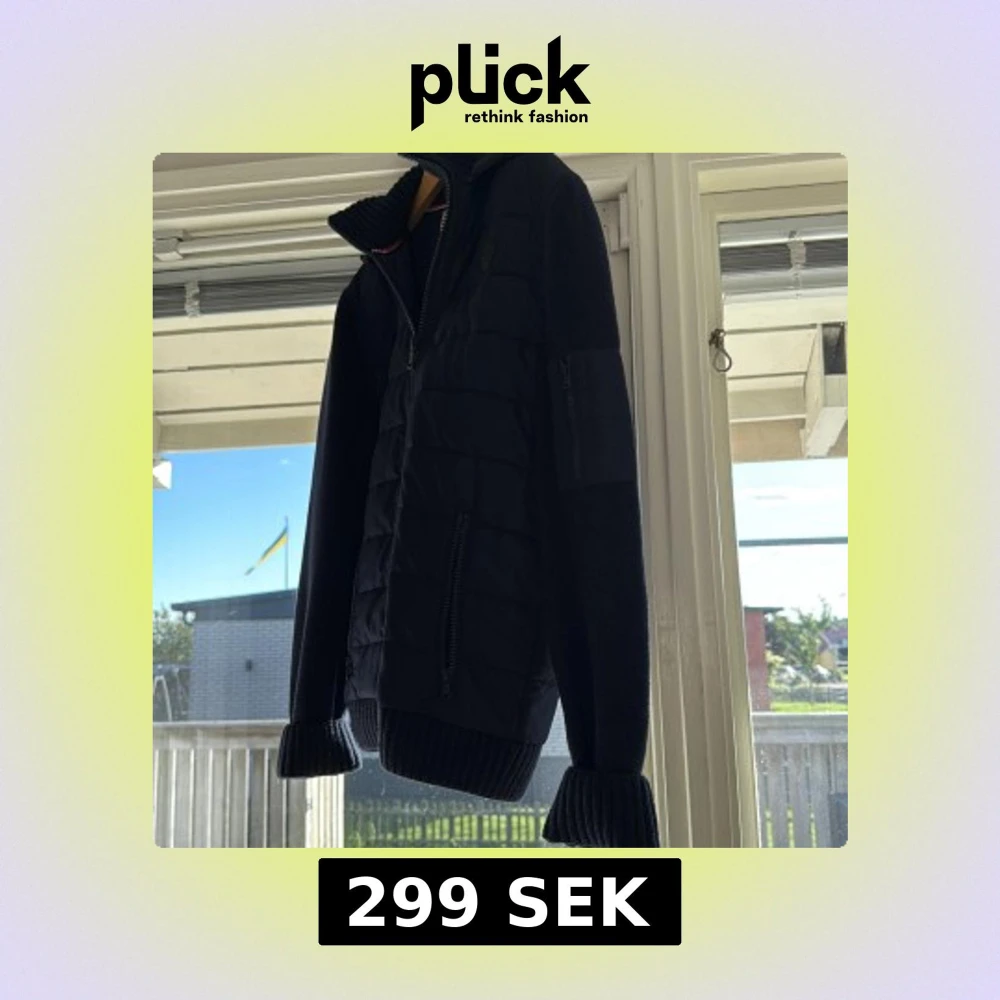 Svart quiltad jacka från Pier One med stickade ärmar och ribbade muddar. Jackan har huva, dragkedja framtill och en snygg badge på bröstet. Perfekt för kyliga dagar och har en clean, modern look. Passar mig som är en M och är lite stor för mig.
