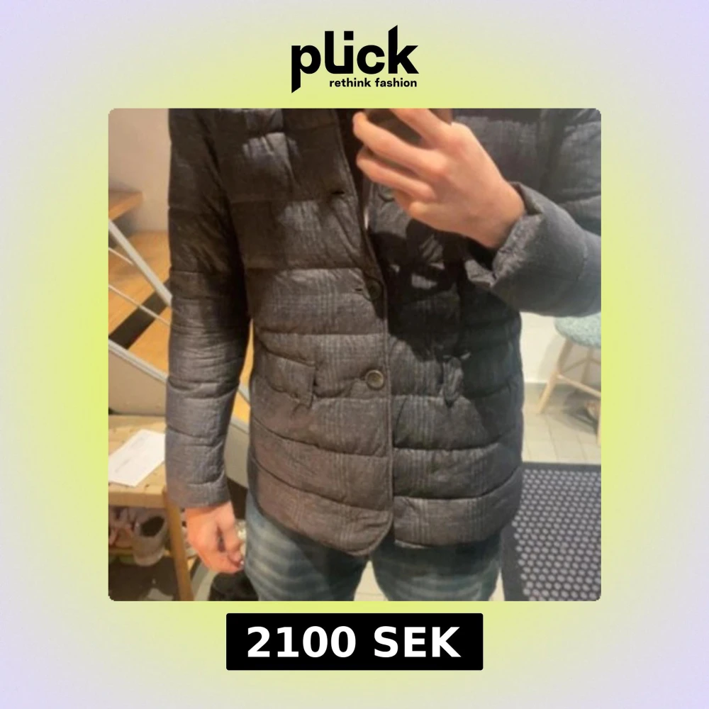 Snygg grå dunjacka från Herno med diskret rutigt mönster. Jackan har klassisk krage, knäppning med tre knappar och två stora fickor framtill. Den är quiltad och har en stilren look som passar perfekt till jeans. Perfekt för kyliga dagar.