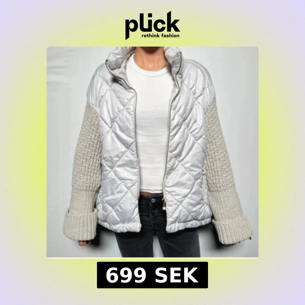 Säljer en unik quiltad jacka i silver från Royal Cat med stickade, ljusgrå ärmar och breda muddar. Jackan har dragkedja framtill och coolt rutmönster på kroppen. Perfekt för dig som vill sticka ut med en modern och mysig look. Säljer pga inte min stil längre💗💗