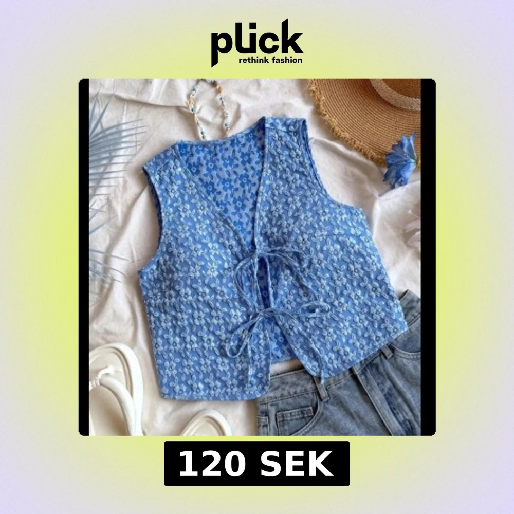 Supersöt blå väst med ljusblått blommönster och v-ringning. Västen har två knytband framtill och är lätt croppad. Perfekt att styla över en t-shirt eller klänning för en chill sommarlook.