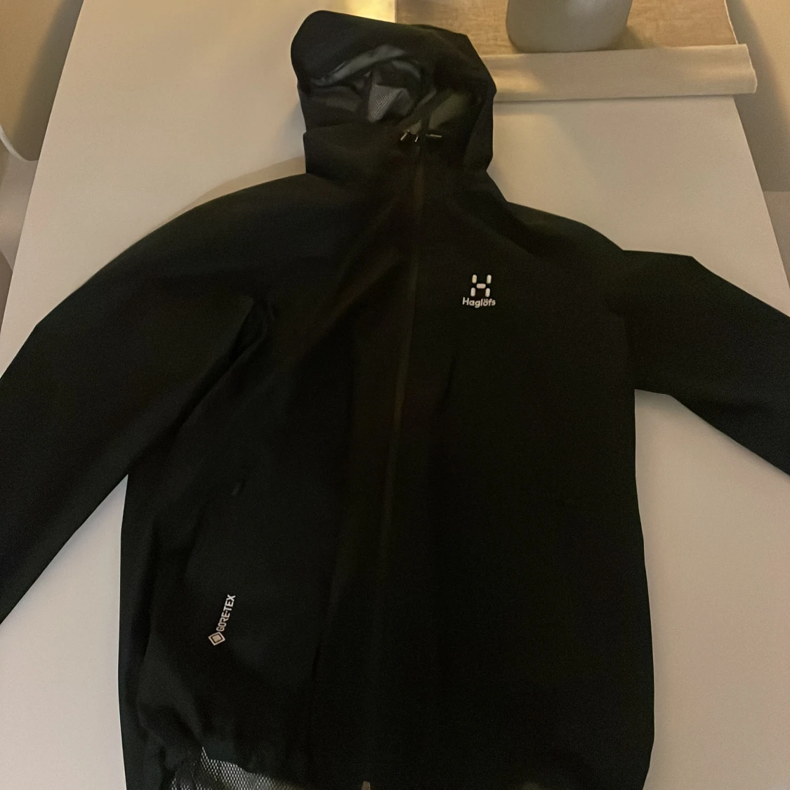 Säljer en svart regnjacka från Haglöfs i storlek S. Jackan har en praktisk huva och dragkedja framtill. Perfekt för regniga dagar och utomhusaktiviteter. Det är goretex vilket gör den bättre mot vind och regn. Mycket bra skick. Använd cirka 5 gånger. Skick 9,5/10