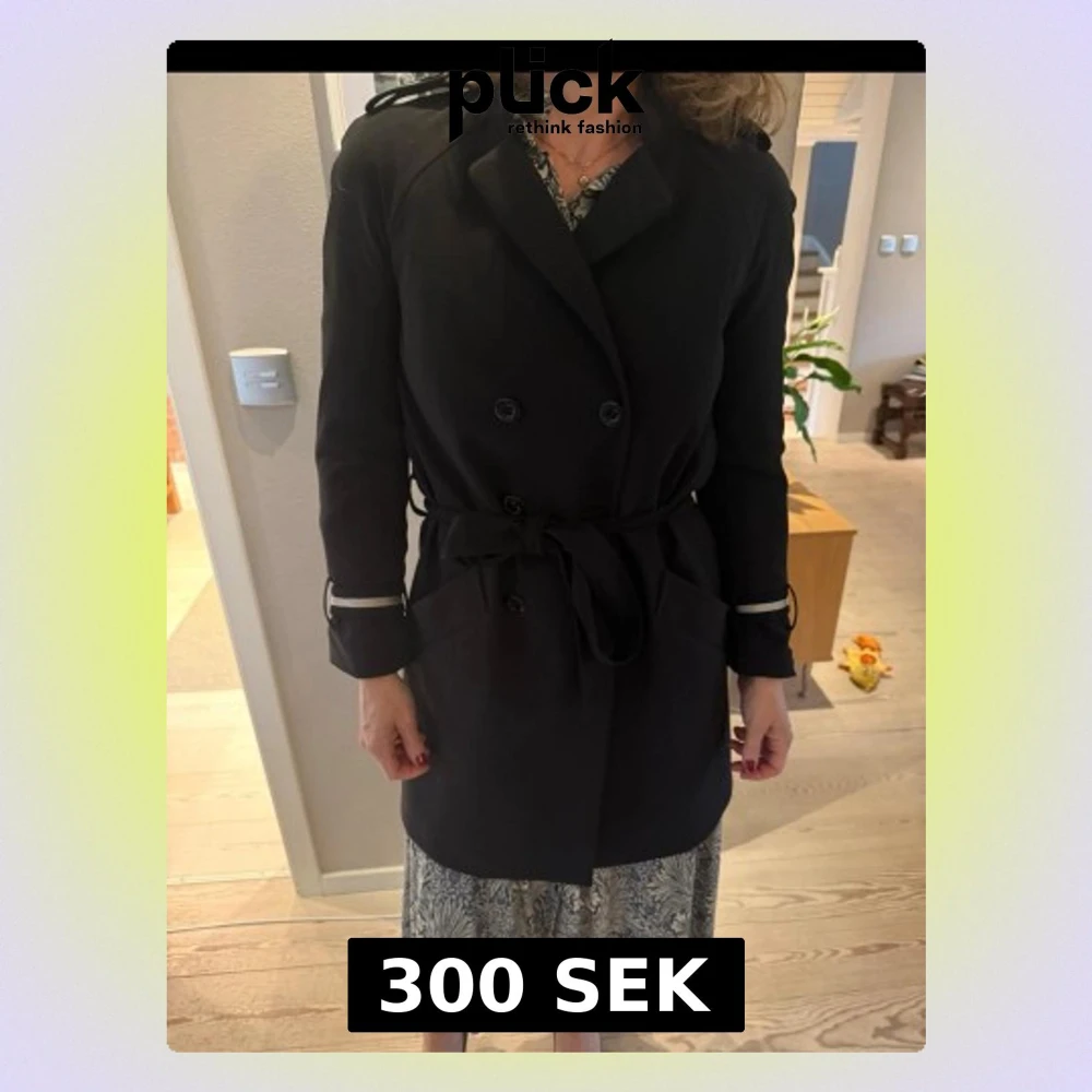 Stilren svart trenchcoat från ALIX i storlek S. Jackan har dubbelknäppning, knytskärp i midjan och stora fickor framtill. Klassisk krage och dekorativa detaljer vid axlar och ärmslut. Perfekt för övergångssäsonger.