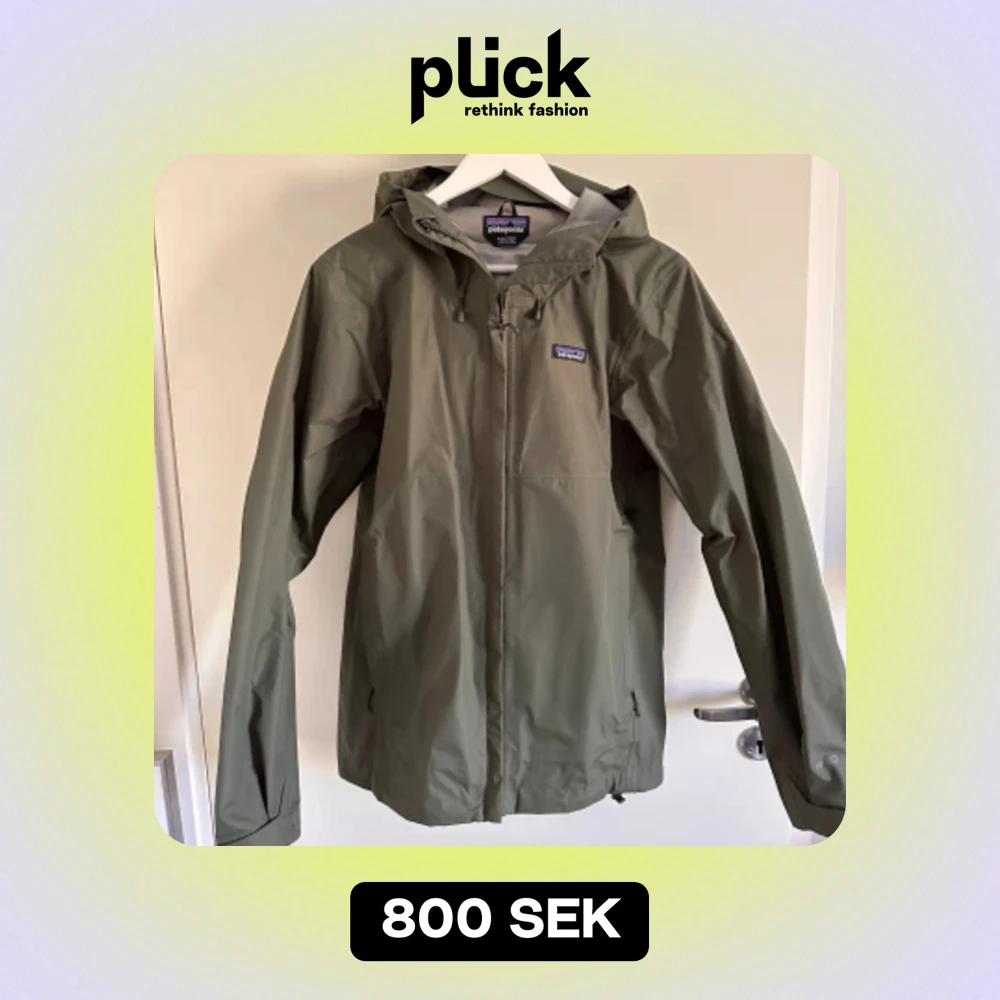 Grön regnjacka som är vattenavvisande och vindtålig.