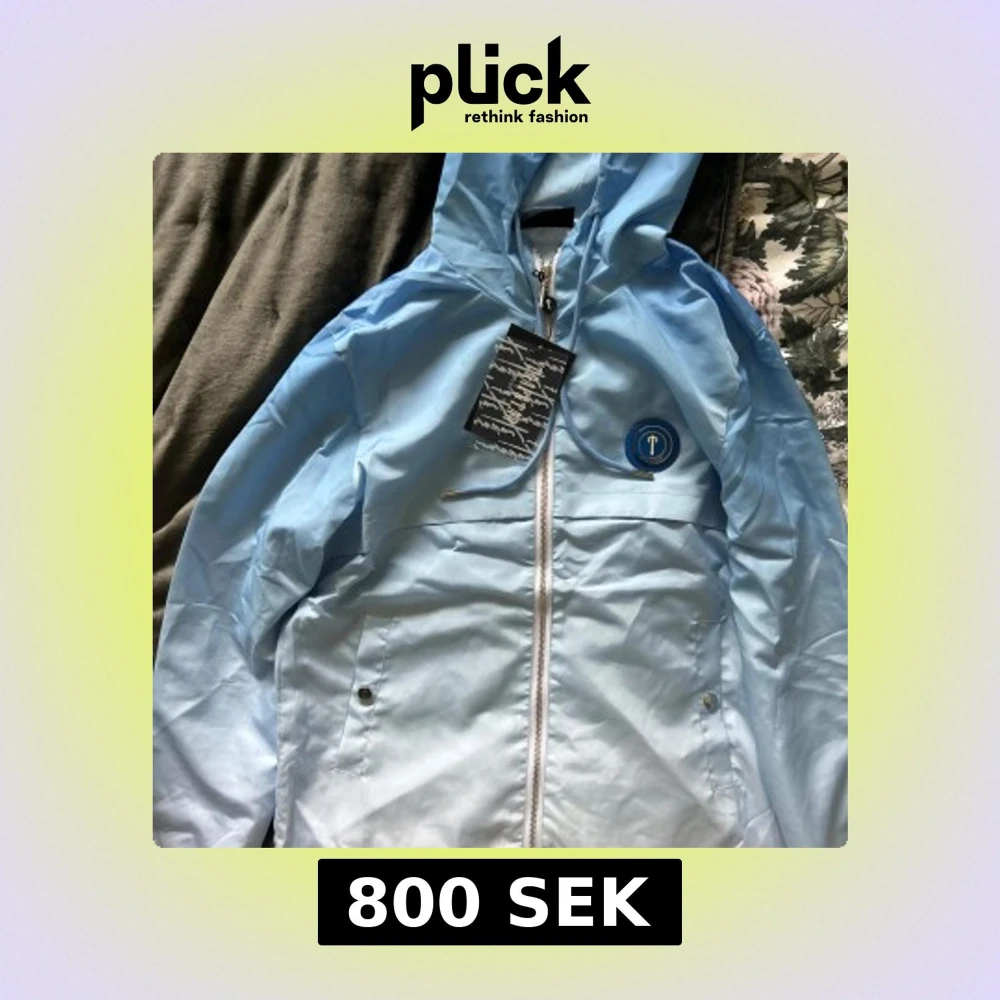 Säljer en ljusblå vindjacka från Trapstar med huva och hel dragkedja framtill. Jackan har två fickor med knappar och en rund logotyp på bröstet. På ryggen finns en stor broderad text. Perfekt för vår och sommar.