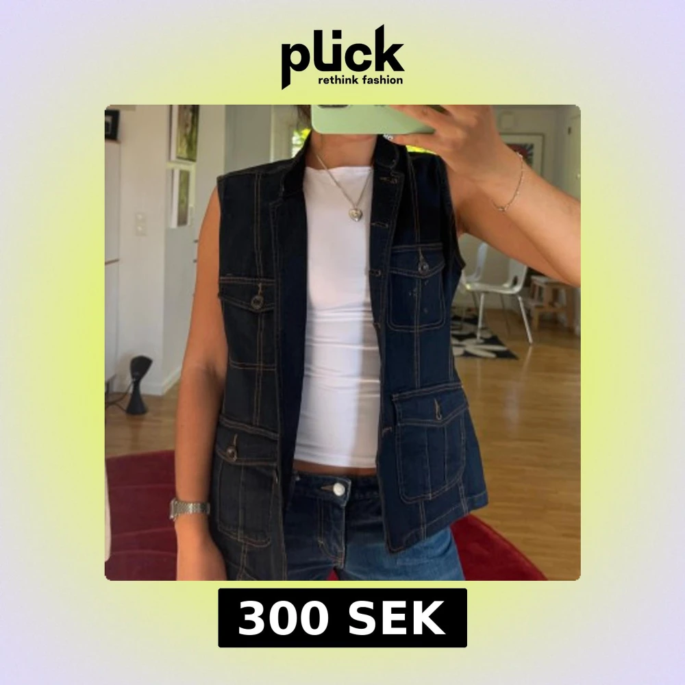 Snygg mörkblå jeansväst med kontrastsömmar och fyra stora fickor framtill, alla med knappstängning