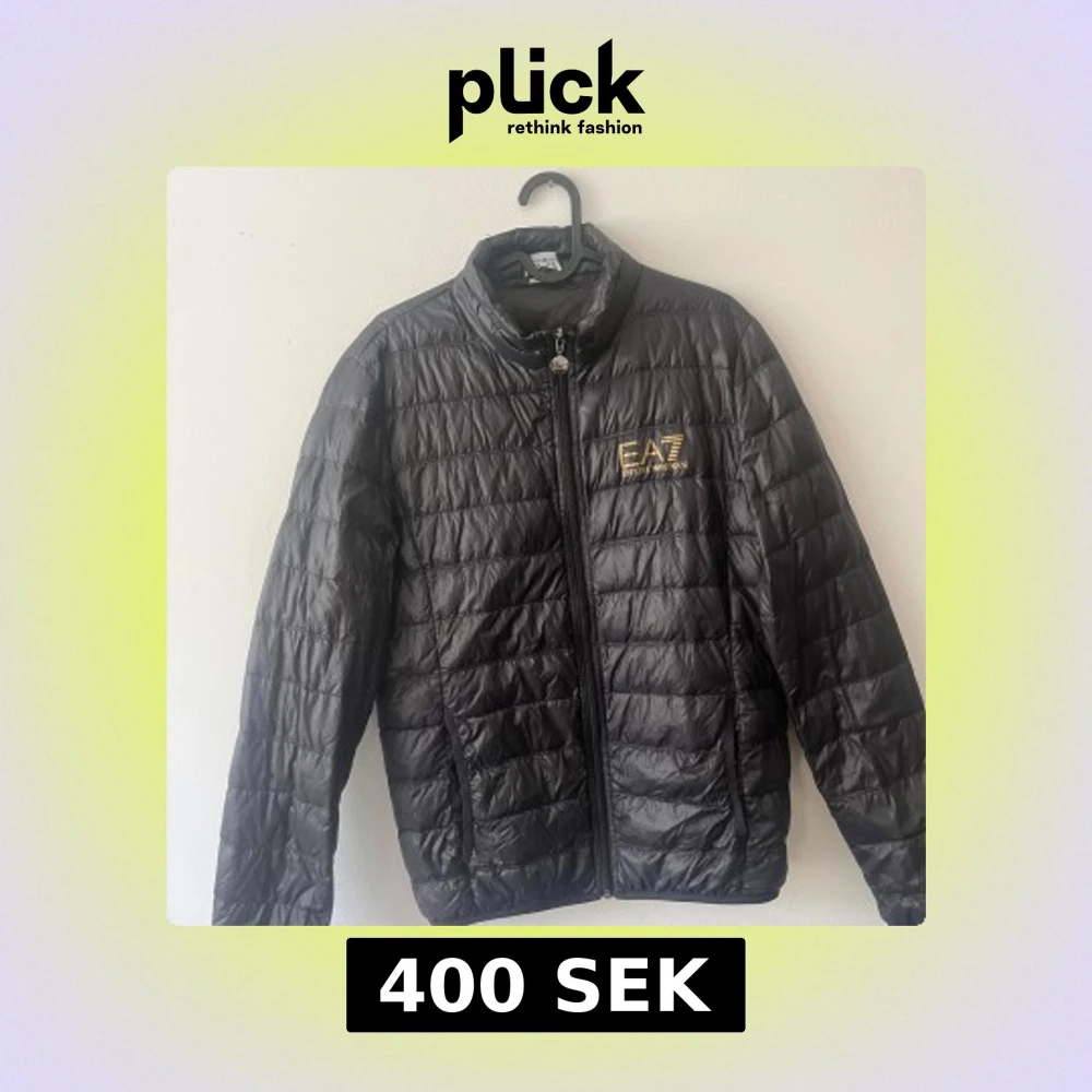 Säljer en svart dunjacka från EA7 Emporio Armani med quiltad design och dragkedja framtill. Jackan har hög krage och logga på bröstet. Perfekt för kyligare dagar och enkel att matcha med olika outfits.