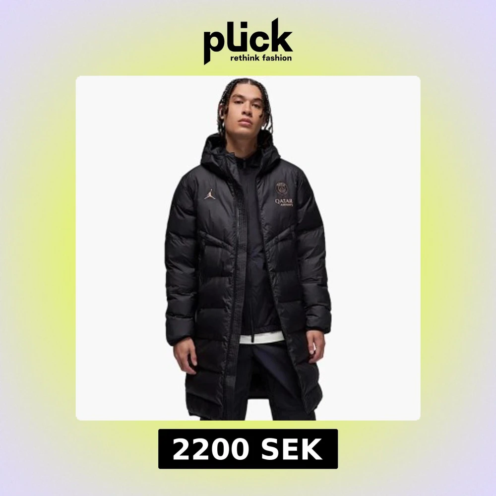 Lång svart dunjacka med huva från Jordan x PSG. Jackan har broderade loggor på bröstet, hel dragkedja och två sidofickor. Puffig design med horisontella sömmar och sportig vibe. Perfekt för kalla dagar när du vill hålla stilen.