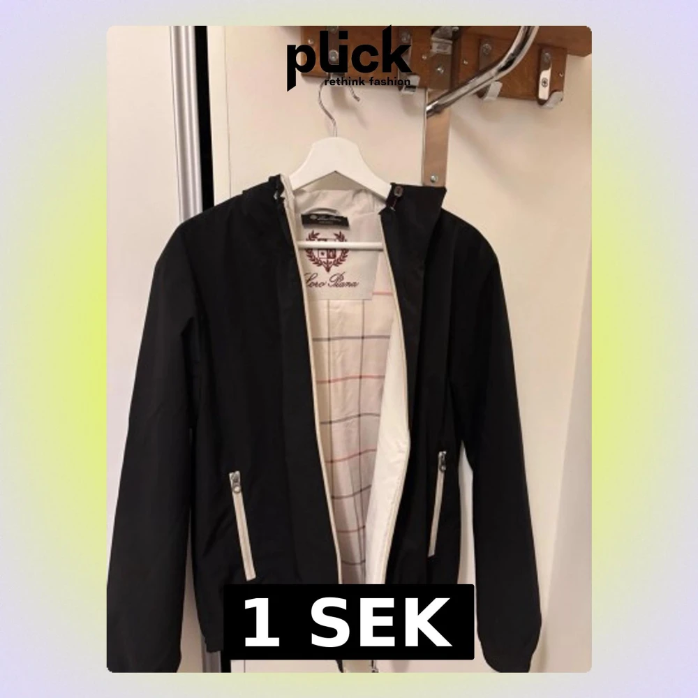 Svart vindjacka från Loro Piana med vit dragkedja och fickor. Jackan har huva och ett ljust foder med rutigt mönster i beige och rött. Perfekt för dig som gillar stilren och sportig look. Lätt och smidig att bära, passar till många outfits.