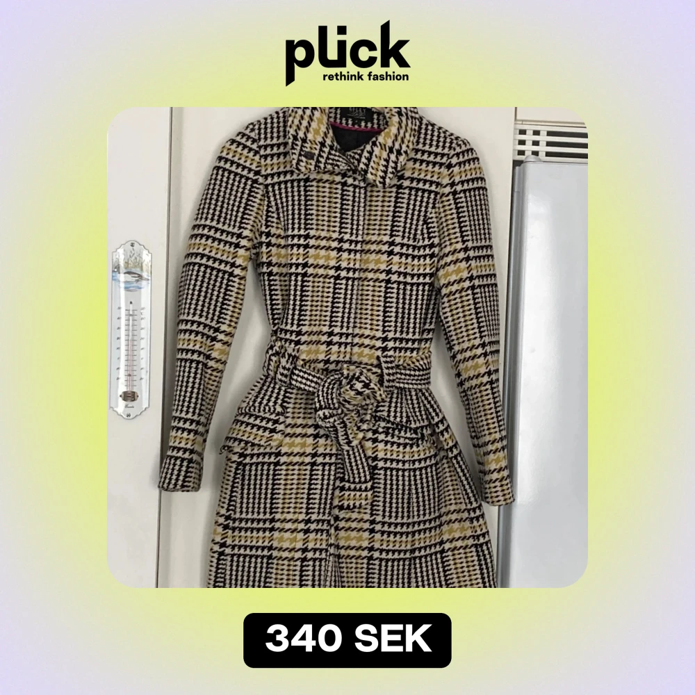 Säljer en superfin rutig kappa från Riley De Luxe i storlek S. Den har ett klassiskt hundtandsmönster i svart, vitt och gult. Kappan är långärmad och har ett bälte i midjan för en snygg passform. Perfekt för höst och vår!