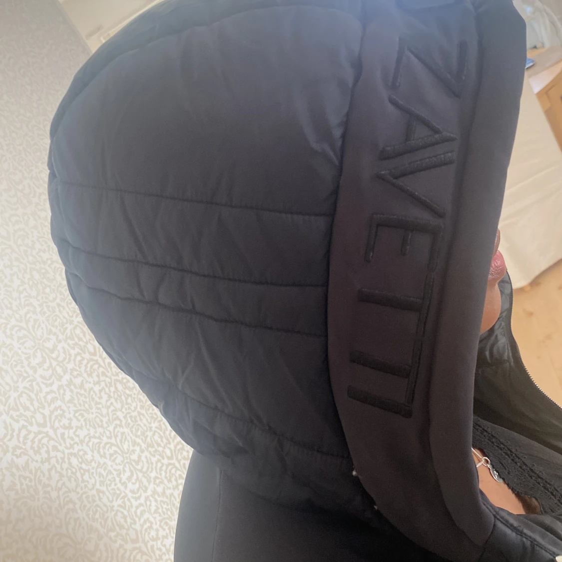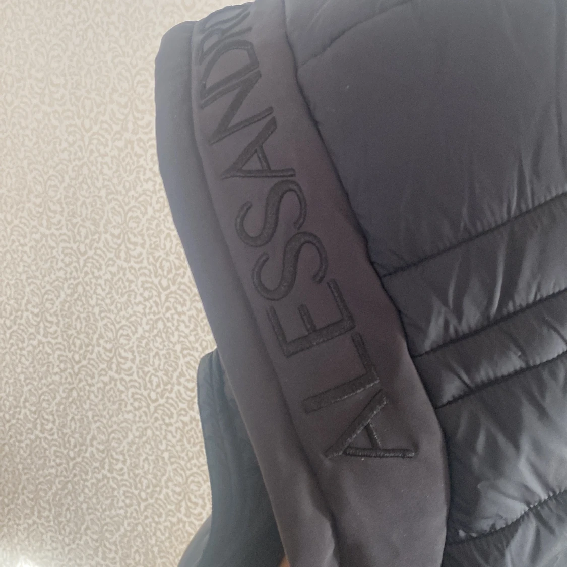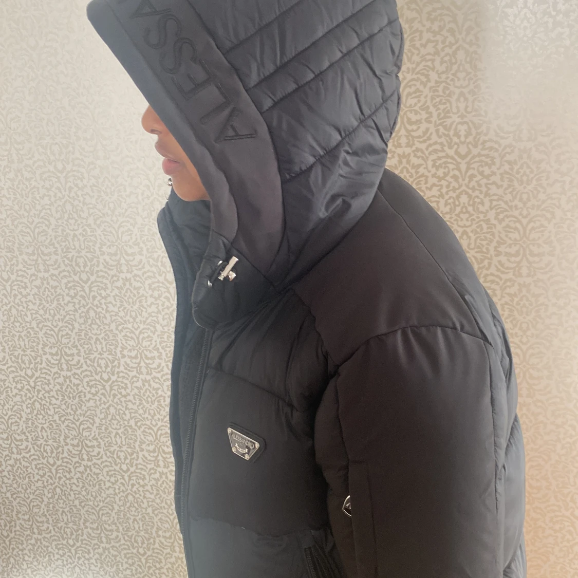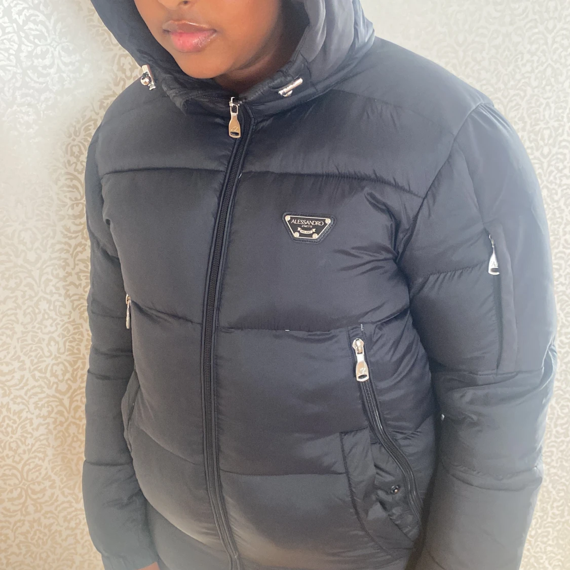 Snygg svart dunjacka från Alessandro Zavetti med huva och dragkedja. Jackan har en stilren design med märkets logga på bröstet och huvan. Perfekt för kyliga dagar.