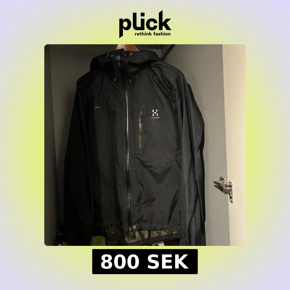 Säljer en svart regnjacka från Haglöfs med dragkedja och justerbar huva. Jackan har en bröstficka med dragkedja och är perfekt för regniga dagar. Den är både funktionell och stilren.