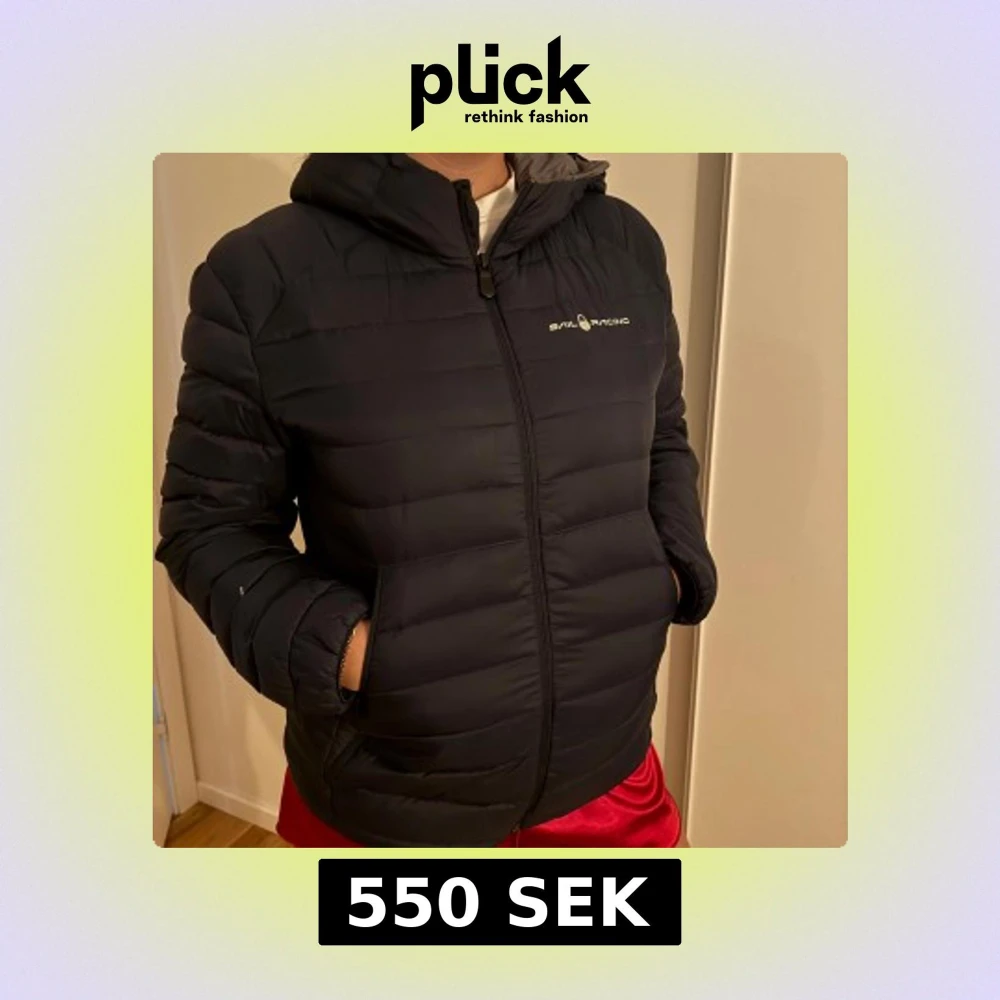 Säljer en mörkblå pufferjacka från Sail Racing med huva och dragkedja framtill. Jackan har två sidofickor och diskret logga på bröstet. Insidan är ljusgrå och materialet känns lätt och smidigt, perfekt för kyliga dagar.