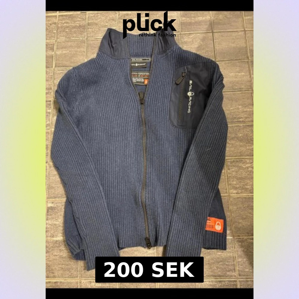 Säljer en blå stickad jacka från Sail Racing, modell Antarctica Expedition. Jackan har ribbad struktur, hel dragkedja framtill och en praktisk bröstficka med dragkedja och logga. Perfekt för dig som gillar sportig och stilren look.