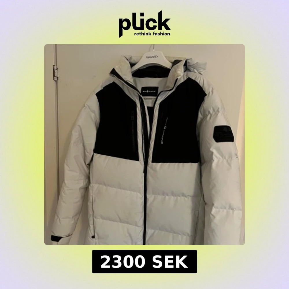 Säljer en snygg vit och svart dunjacka från Sail Racing. Jackan har en justerbar huva och dragkedja framtill. Perfekt för kalla dagar med sin isolerande design. Den har också en cool logga på bröstet och baksidan.