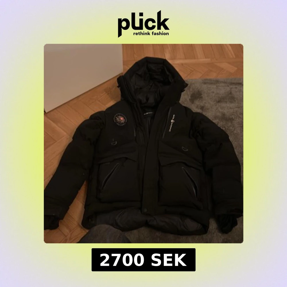 Säljer en svart Sail Racing Antarctica Expedition dunjacka med huva och flera praktiska fickor med dragkedja. Jackan har Sail Racing-logga på bröstet och patch på axeln. Materialet är polyester och polyamid med dunfyllning, perfekt för kalla vinterdagar.
