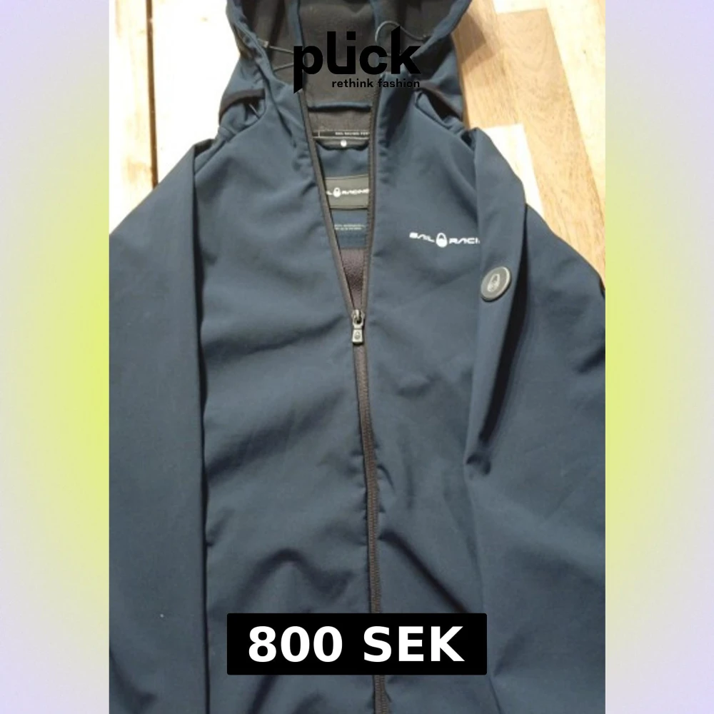 Snygg mörkblå vindjacka från Sail Racing med huva och dragkedja framtill. Jackan har logotyp på bröstet och ärmen, samt en metallbadge med Sail Racing-symbolen. Materialet är slätt och känns som polyester, perfekt för blåsiga dagar.
