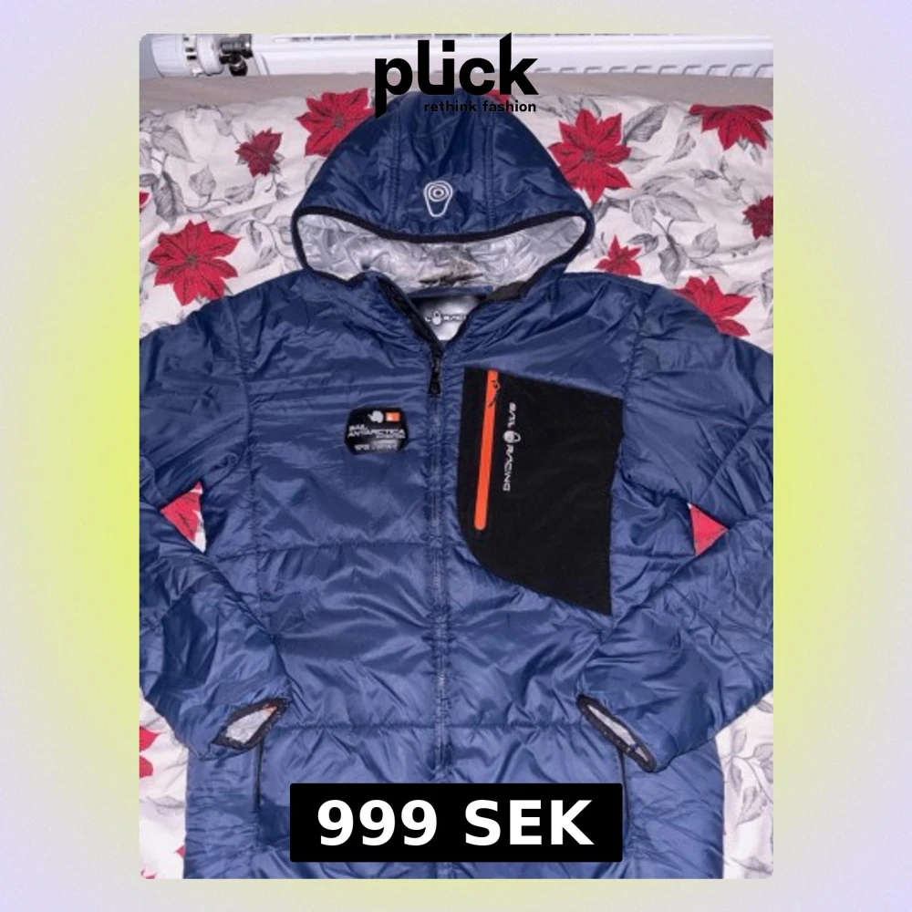 Blå pufferjacka från Sail Racing med huva och coolt Sail Antarctica-märke på bröstet. Jackan har svart panel med orange dragkedja på vänster sida och två sidofickor med dragkedja. Materialet är polyester och jackan är perfekt för kalla dagar.