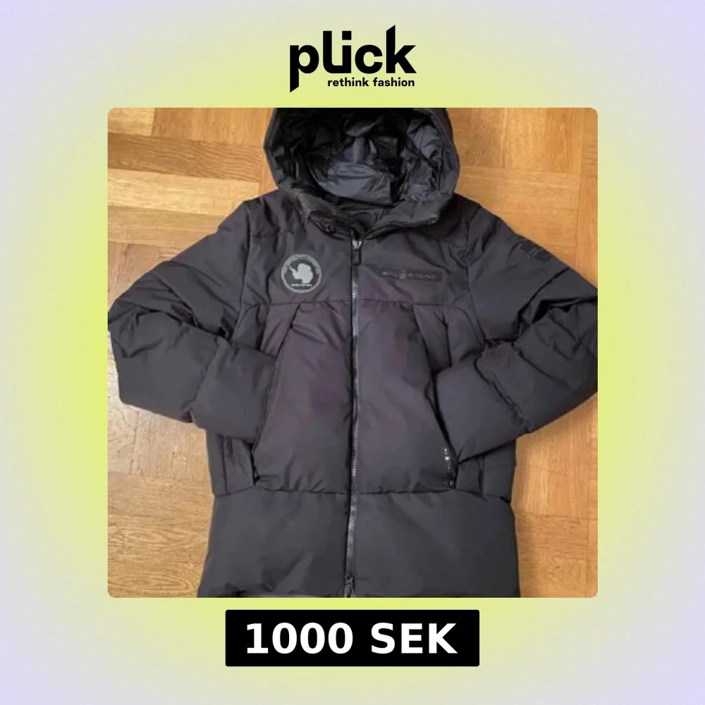 Säljer en svart dunjacka från Sail Racing med huva och dragkedja. Jackan har en stilren design med en logotyp på bröstet och armen. Perfekt för kyliga dagar.