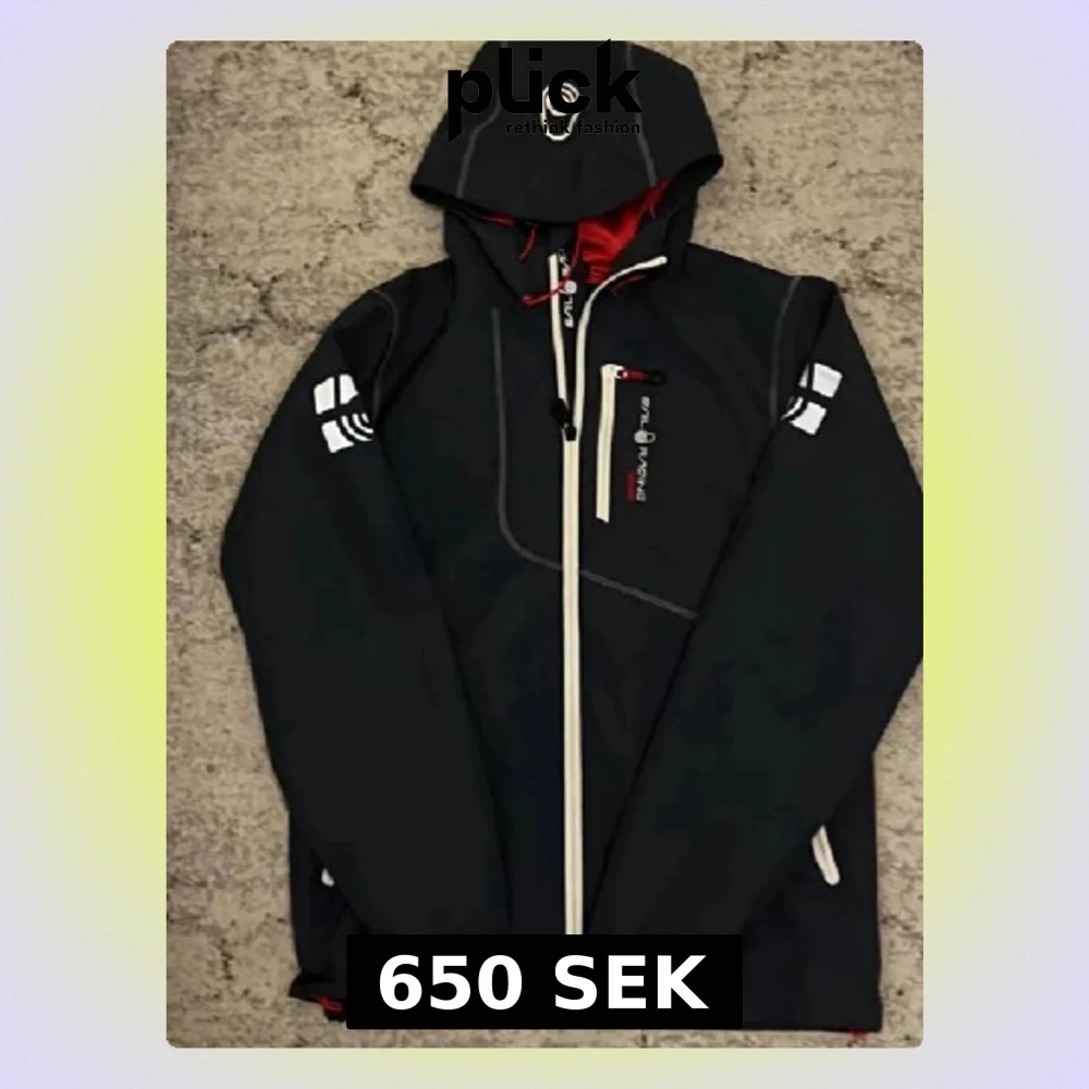 Säljer en svart vindjacka från Sail Racing med vita detaljer och dragkedjor. Jackan har huva, vita loggor på ärmarna och bröstet samt röd mesh på insidan.