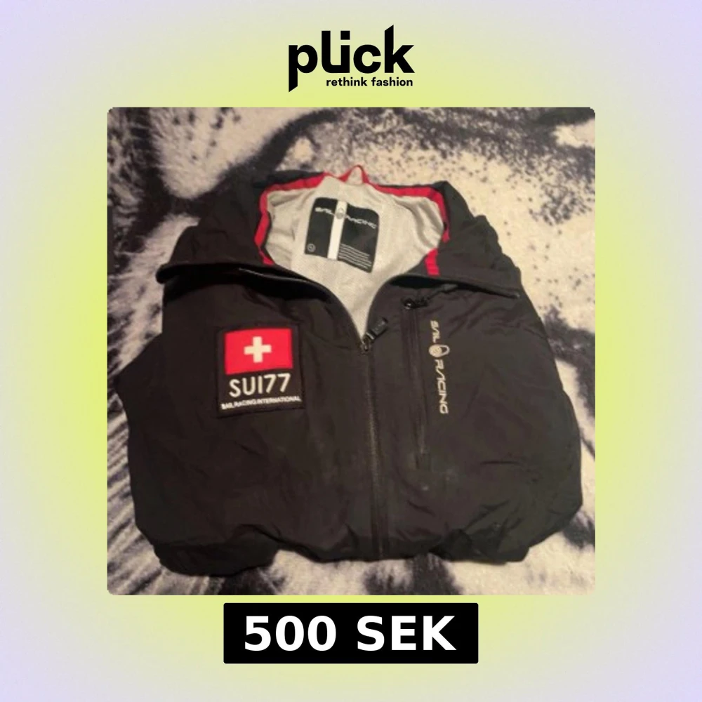 Säljer en svart jacka från Sail Racing med dragkedja och broderade detaljer. Jackan har en Schweiz-flagga och texten 'SU177' på framsidan. Perfekt för dig som gillar stilren design med sportig touch.