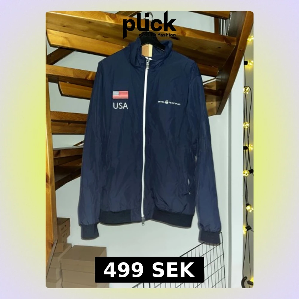 Blå vindjacka från Sail Racing med vita detaljer och dragkedja. USA-flagga och text på bröstet samt ryggen. Pris diskuterbart