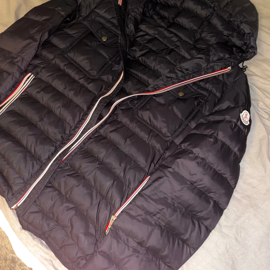 Snygg svart dunjacka från Moncler med huva. Säljer jackan då den inte kommer till användning priset är inte hugget i sten