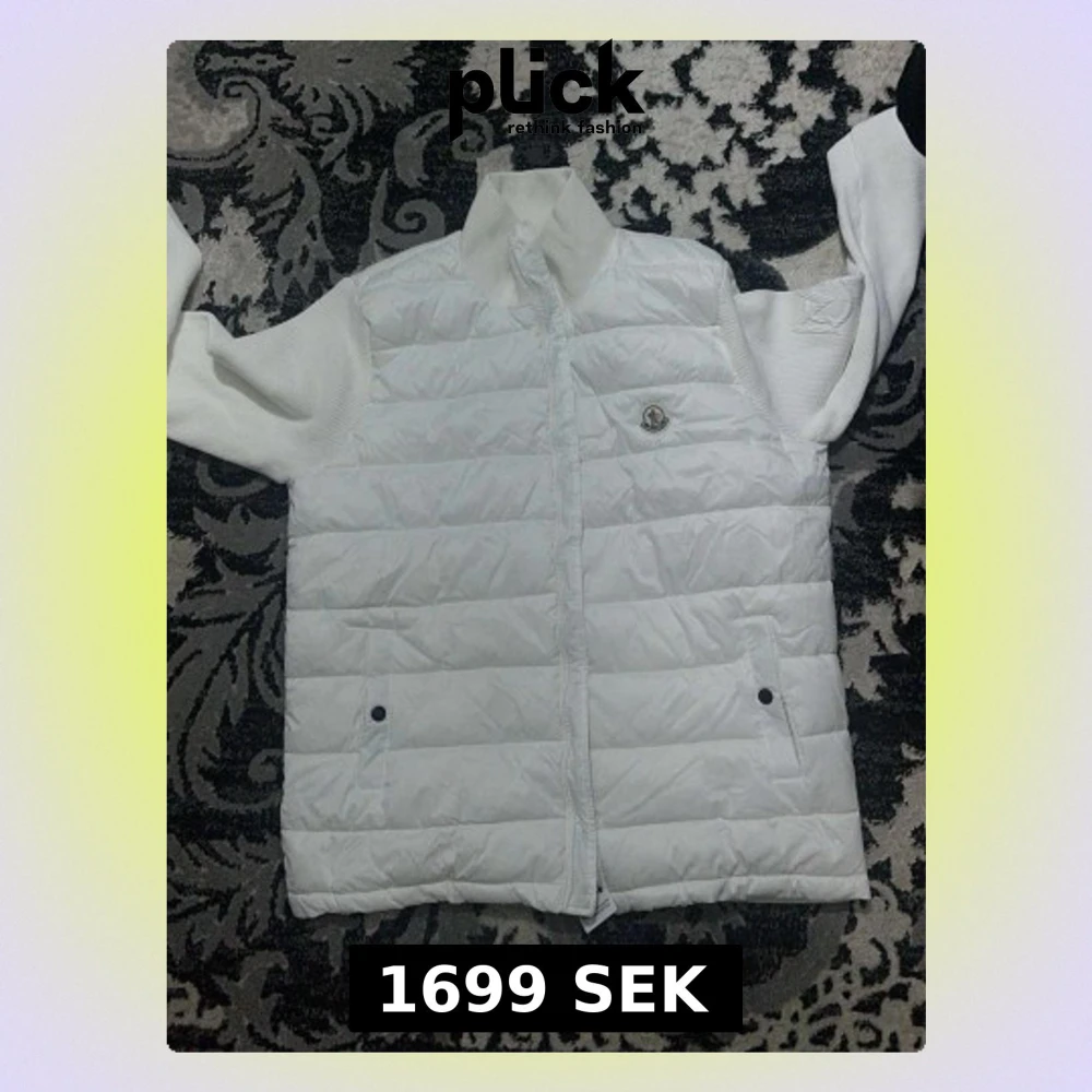 Säljer en fräsch vit pufferjacka från Moncler med stickade ärmar och hög krage. Jackan har dragkedja framtill, två fickor med knapp och ett broderat Moncler-märke på bröstet. Perfekt för dig som gillar stilren och clean look.