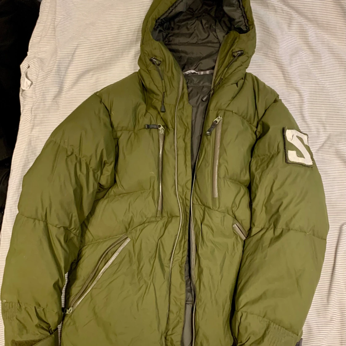 Säljer en grön dunjacka från Salomon med huva, insydd fleecehuva, utanpåliggande dunhuvs samt flera dragkedjeförsedda fickor. Jackan har ett stort S-märke på vänster ärm och quiltad design. Insidan är grå med tryckt motiv och praktiska innerfickor. Perfekt för kalla dagar. Har avtagbart snölås och midjedel.