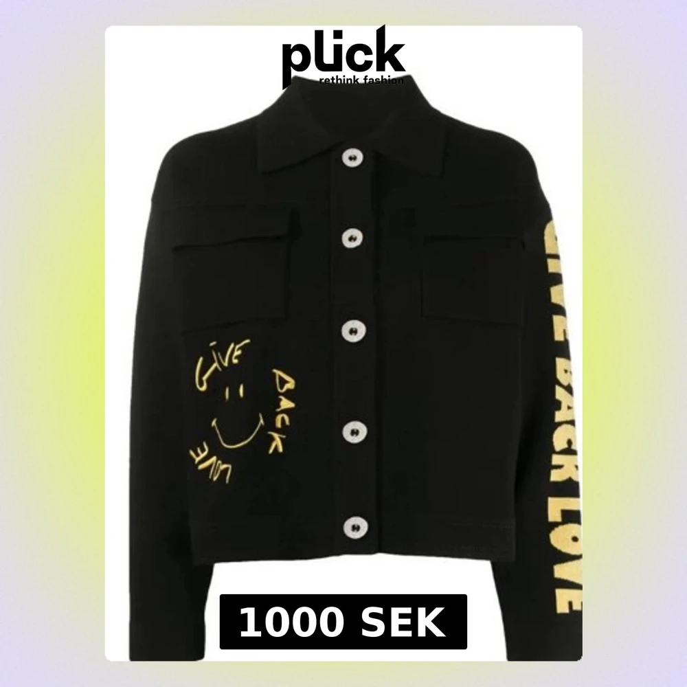 Cool svart oversize jacka med stora knappar och tryck i gult och vitt. Framsidan har bröstfickor och ett handskrivet smiley-motiv med texten 'Give Back Love'. På ena ärmen står samma text i gult och på ryggen finns en stor rund patch med smiley och text.