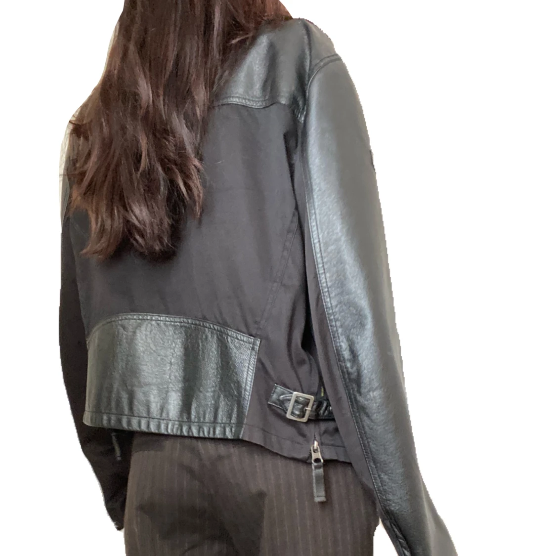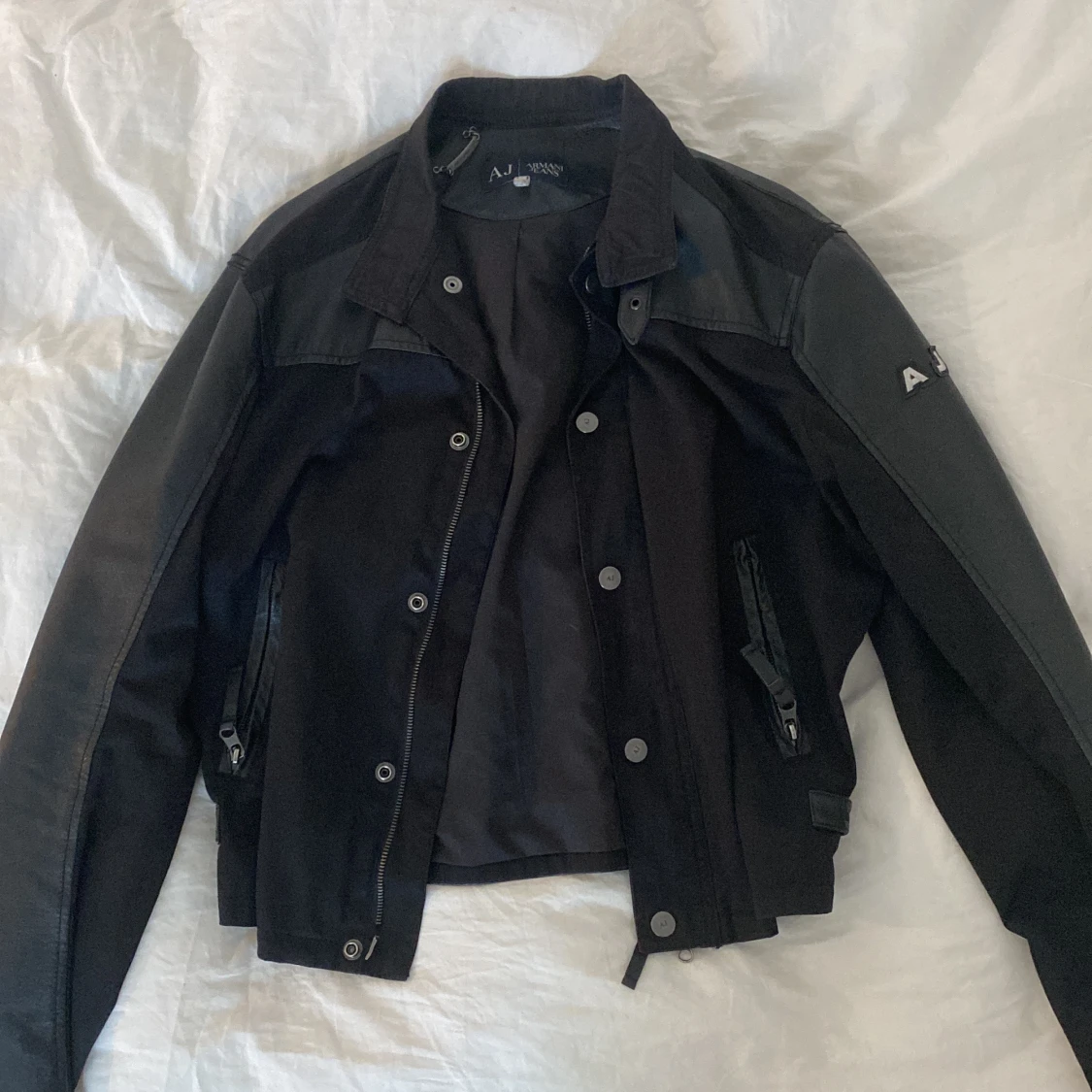 Sååå fin läderjacka från armani jeans köpt på humana, använder tyvärr för sällen så därför jag säljer. Storlek L men sitter bra på mig som brukar ha S, toppenskick. Använde gärna köp nu :) o har du nån fråga är det bara att skicka ett meddelande.