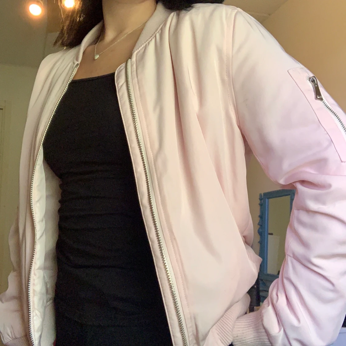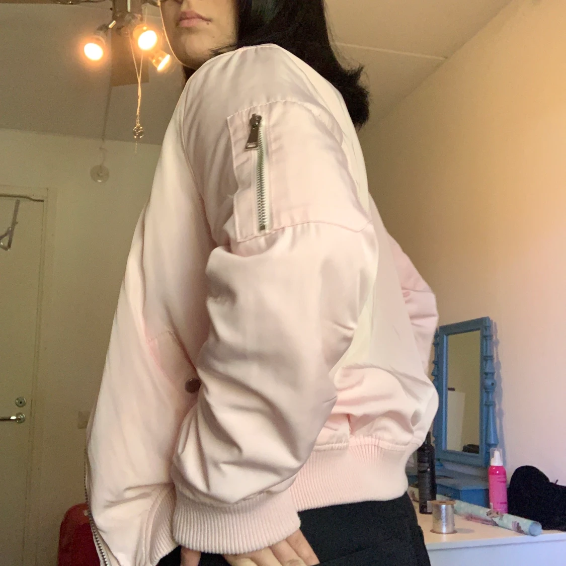 En ljusrosa bomberjacka